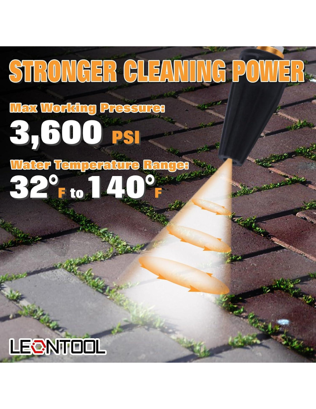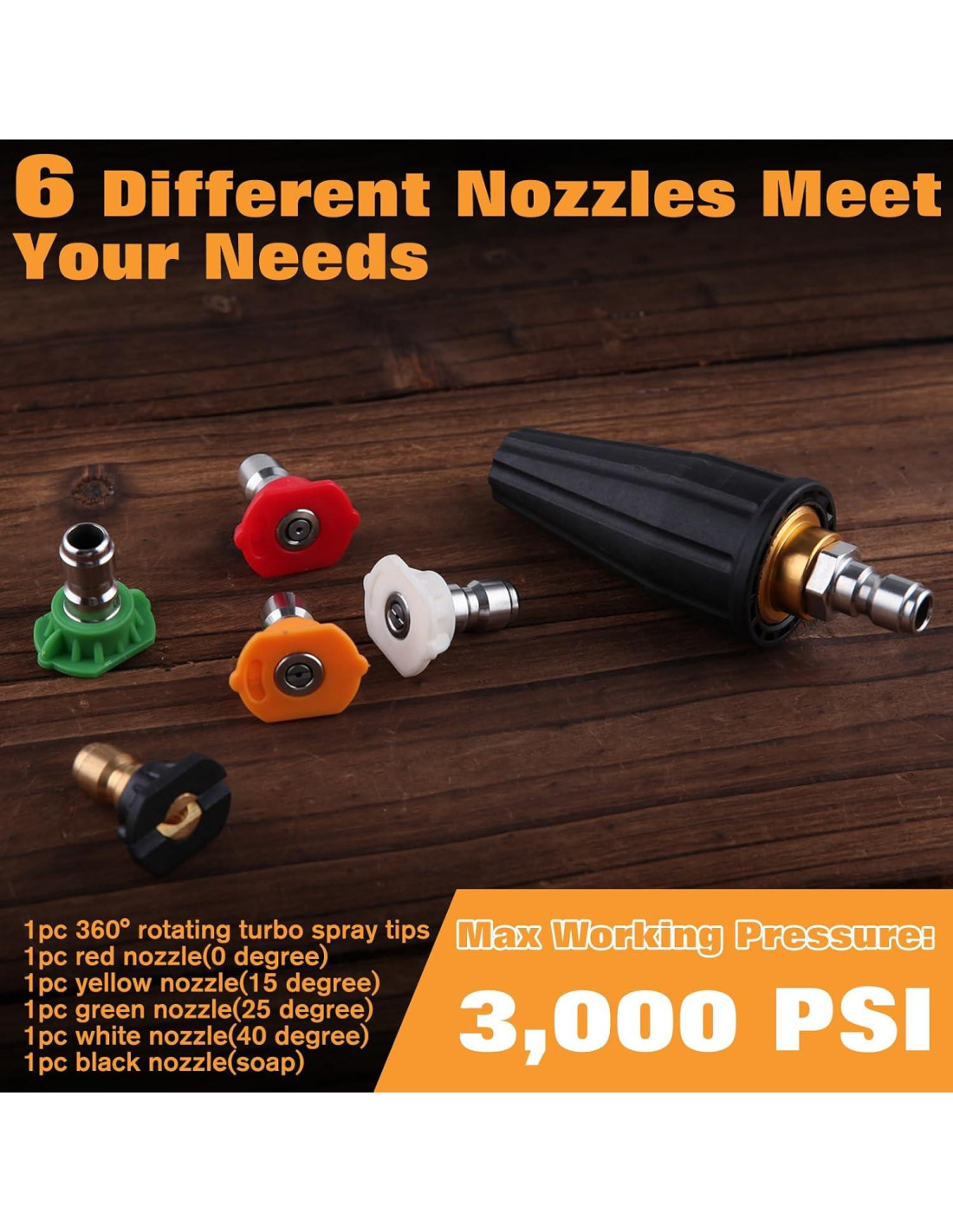 - Compatibilidad: Equipadas con conexiones rápidas de 1/4", estas boquillas de lavadora a presión se pueden acoplar fácilmente a la mayoría de las lavadoras a presión. Presión máxima de trabajo: 3600 PSI para la boquilla turbo, 3000 PSI para la boquilla de spray