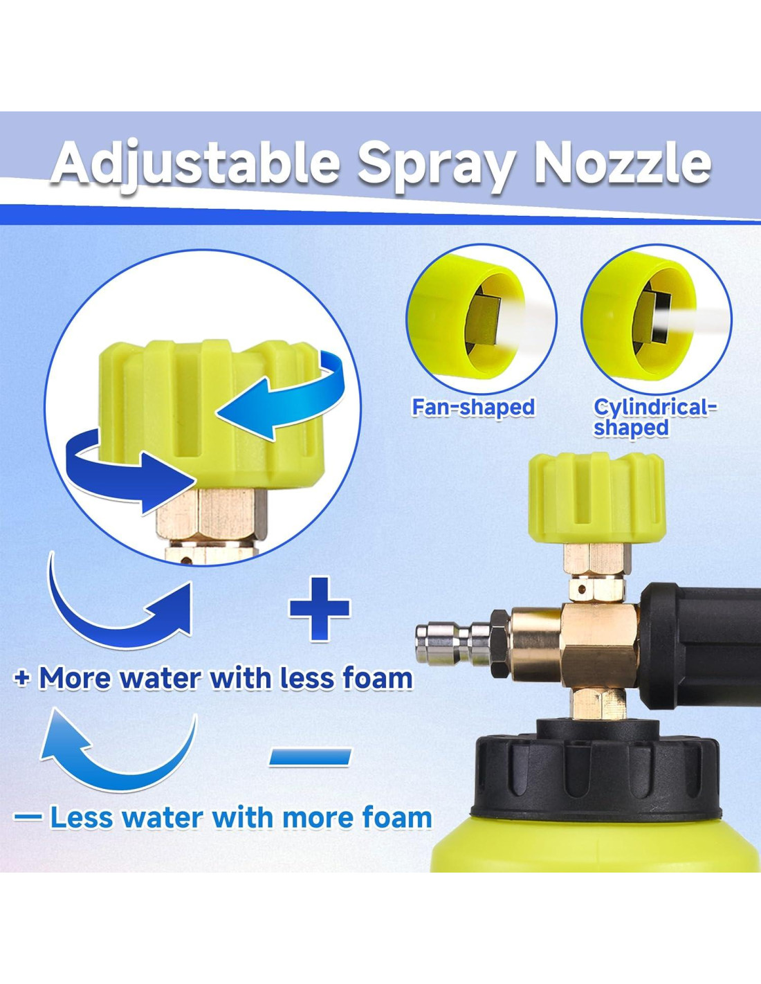 - Cañón de Espuma de Lavadora a Presión Grueso: Capacidad grande de 1 litro con un diseño de boca ancha, produce rápidamente espuma gruesa y uniforme. Boquilla ajustable para diferentes modos de pulverización, ofreciendo la máxima eficiencia y resultados para tus trabajos de limpieza.