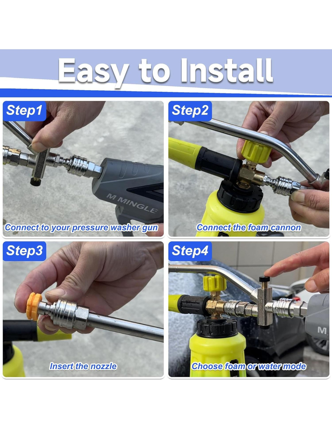 - Cambio Rápido de Espuma a Agua: Cambia fácilmente entre los modos de espuma y agua con el conector doble del cañón de espuma y el cañón de espuma para lavadora a presión para una limpieza eficiente y que ahorra tiempo.