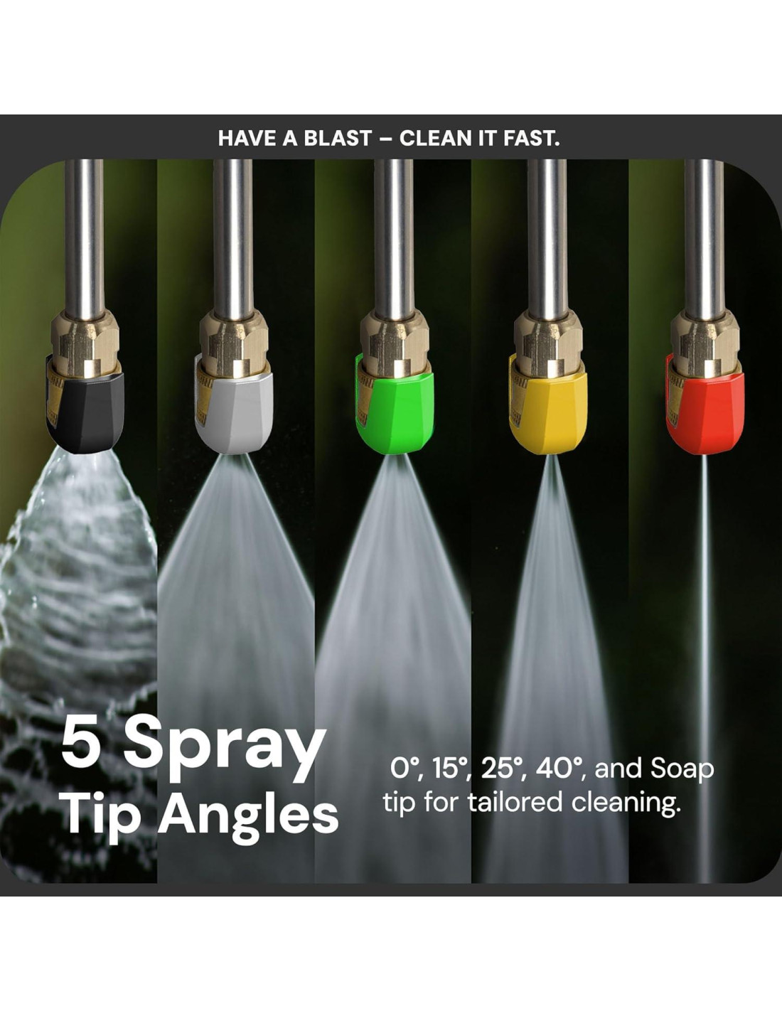 - Limpieza Versátil: Incluye 5 puntas de rociado de Conexión Rápida (0, 15, 25, 40 y jabón) para limpieza personalizada desde chorro preciso hasta ventilador potente, además de un aplicador de jabón conveniente
