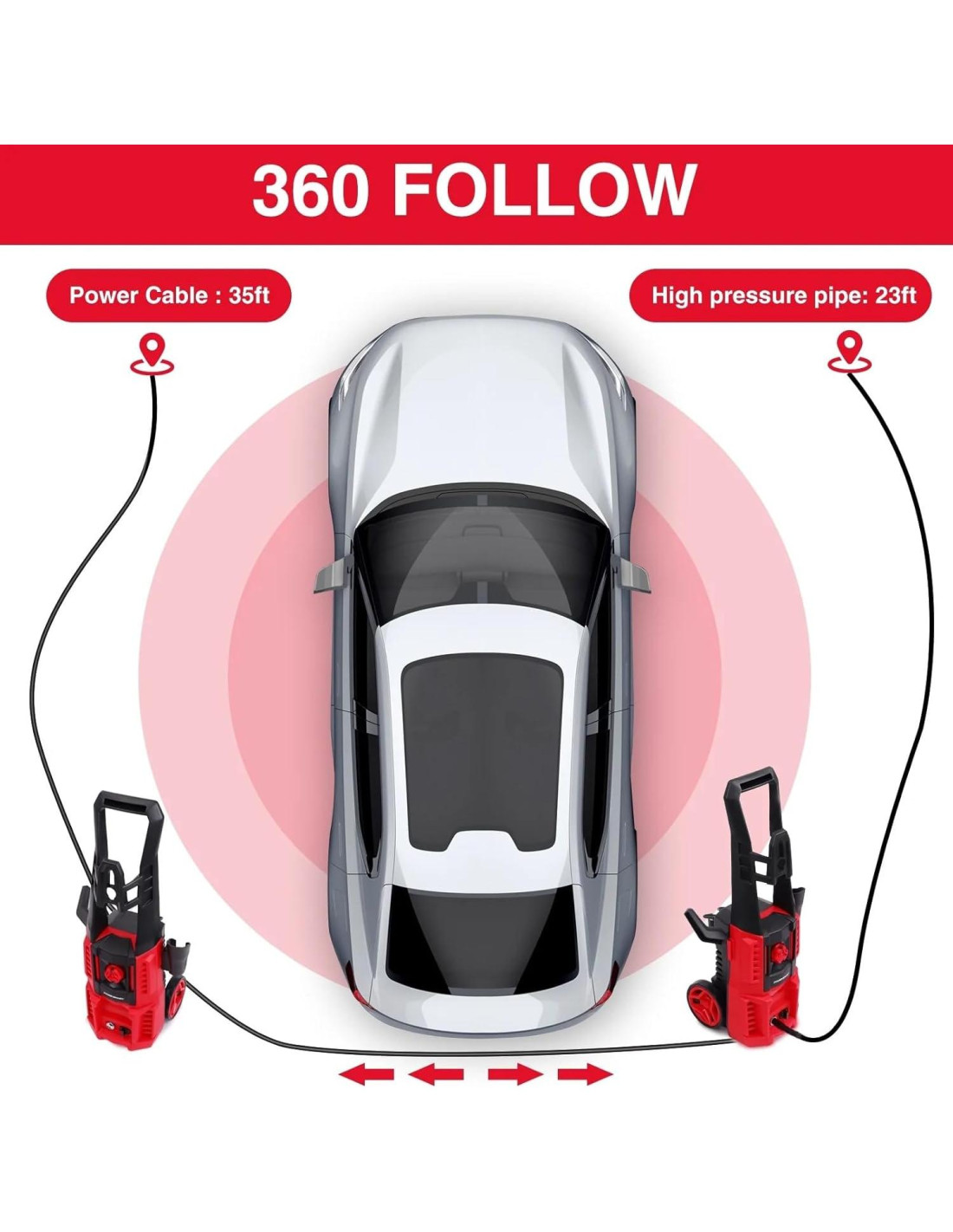 - Ruedas Grandes para Uso en Todo Terreno: Las grandes ruedas de servicio pesado de esta lavadora a presión eléctrica manejan terrenos difíciles con facilidad, lo que la hace ideal para limpiar jardines, sitios de construcción o áreas rurales al aire libre.