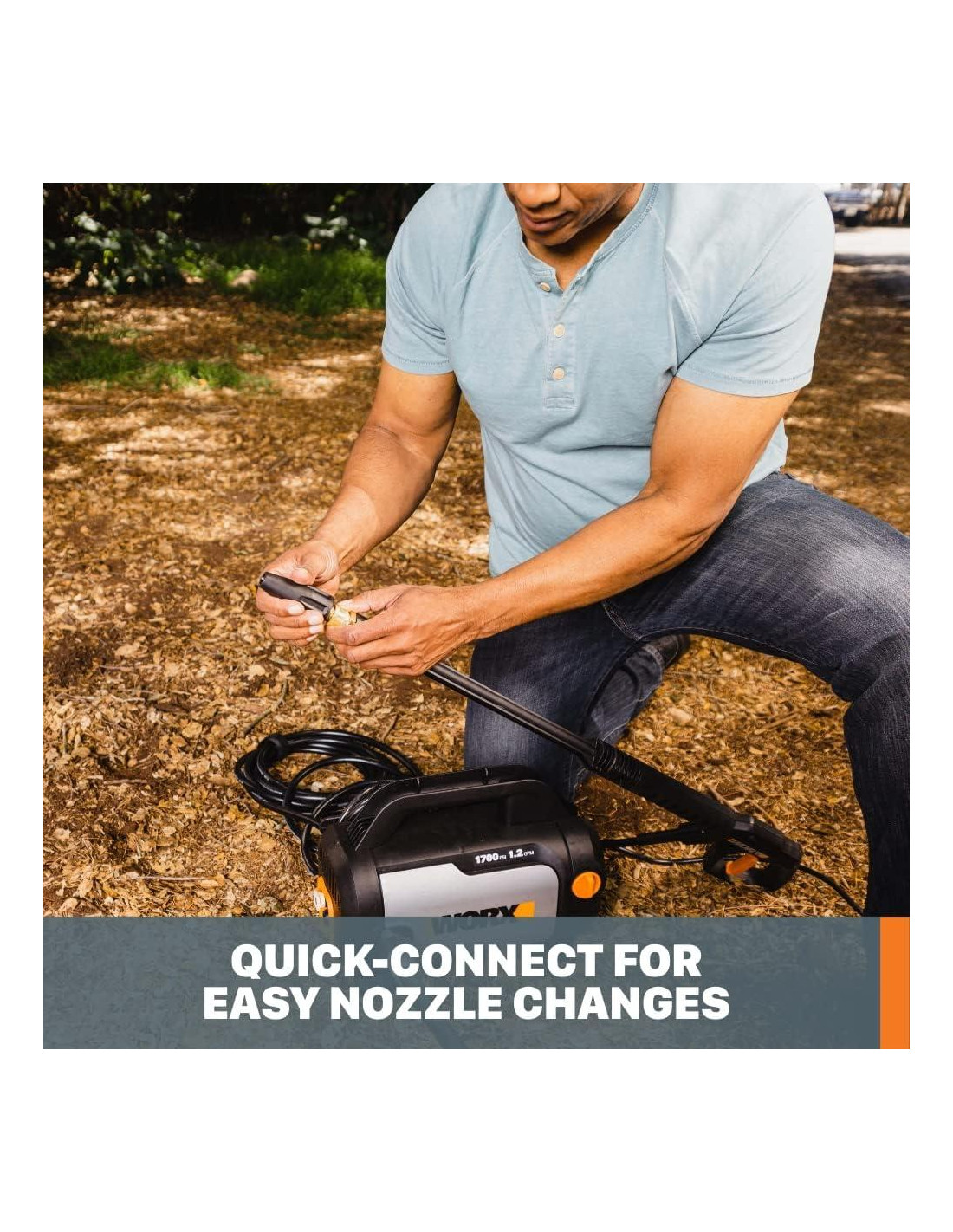La Lavadora a Presión Eléctrica Worx de 13 Amperios y 1700 PSI genera un enorme poder de limpieza para la eliminación de suciedad y mugre alrededor del exterior de la casa o propiedad. Produce 1870 PSI MÁX y 1.2 GPM (1.4 GPM MÁX) para hacer rápidamente el trabajo de limpiar la entrada, la terraza, el revestimiento o la mampostería. También es una gran herramienta para eliminar barro de equipos de camping o deportivos al aire libre o para coches y SUV embarrados. Esta lavadora a presión viene con una boquilla turbo, cuando necesitas máxima presión, digamos, para la mampostería, y una boquilla de 40 grados para cuando necesitas un toque más ligero. Además, el adaptador de conexión rápida universal de de pulgada hace que cambiar entre boquillas sea muy fácil. Pero la mejor parte de esta lavadora a presión portátil puede ser que es simple de usar. No solo tiene un mango de transporte integrado que facilita su movimiento por el jardín, casi cualquiera puede operar todo este poder. La Lavadora a Presión Eléctrica Worx de 1700 PSI no te derribará mientras aún entrega una poderosa fuerza de agua, gracias a su potente motor de 13 Amperios. Y cuando termines de lavar a presión por el día, el almacenamiento a bordo para la boquilla y la varilla y el enrollador de cable integrado hacen que la limpieza sea rápida y fácil.