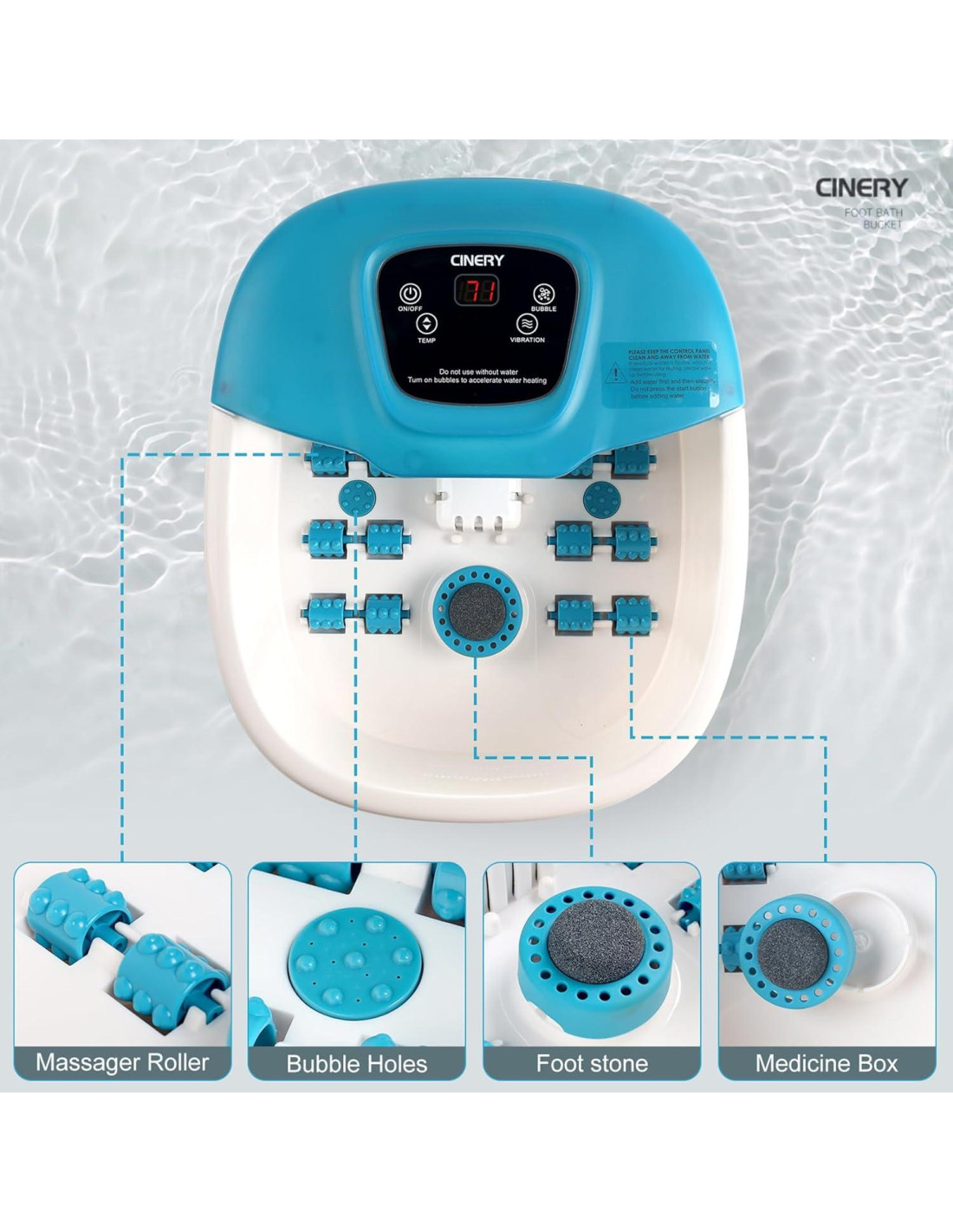 Masajeador de pies Cinery con calor, burbujas, luz roja y vibración--hace que tus pies sean más cómodos. Más de 60 puntos de acupuntura están distribuidos en los pies. Cuando masajeas las plantas de tus pies, estos puntos de acupuntura se envían a todas las partes de nosotros como entrega exprés. Nuestro baño de pies tiene 16 rodillos, y también tiene funciones como calefacción, generación de burbujas, piedra de pedicura, etc. Es una buena manera de relajar tus pies y todo el cuerpo después de un trabajo agotador, y puede aliviar eficazmente la presión de los músculos de los pies y eliminar la fatiga física. El diámetro es de 40 cm (15.7 pulgadas) y se adapta incluso a pies de 30.5 cm (12 pulgadas), lo que es adecuado para toda la familia. Masaje para cuidar tus pies. El pie es como el puesto de mando de los órganos humanos. Hay más de 60 puntos de acupuntura en el pie, y cada punto de acupuntura corresponde a cada función. Si quieres estar saludable, el masaje de pies es una buena opción. Cuando los pies se sumergen en agua tibia, la estimulación térmica acelerará la circulación sanguínea, acelerará el metabolismo, mejorando así la calidad del sueño y retrasando el envejecimiento. Deja ir la fatiga de tu día.