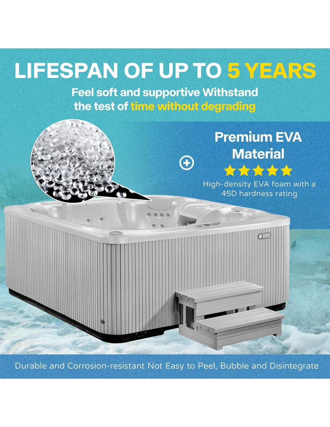 - Material EVA Premium: Fabricada con espuma EVA de alta densidad con una clasificación de dureza de 45D, esta almohada de spa ofrece comodidad y resistencia superiores. A diferencia de los materiales convencionales que pueden pelarse, burbujearse o desintegrarse con el tiempo, nuestra espuma EVA está diseñada para resistir el desgaste y la corrosión, manteniendo su integridad incluso después de una exposición prolongada al agua y a productos químicos. La excepcional durabilidad del material, combinada con su resistencia al agua y a los rayos UV, asegura que su spa Highlife siga siendo un refugio de relajación.