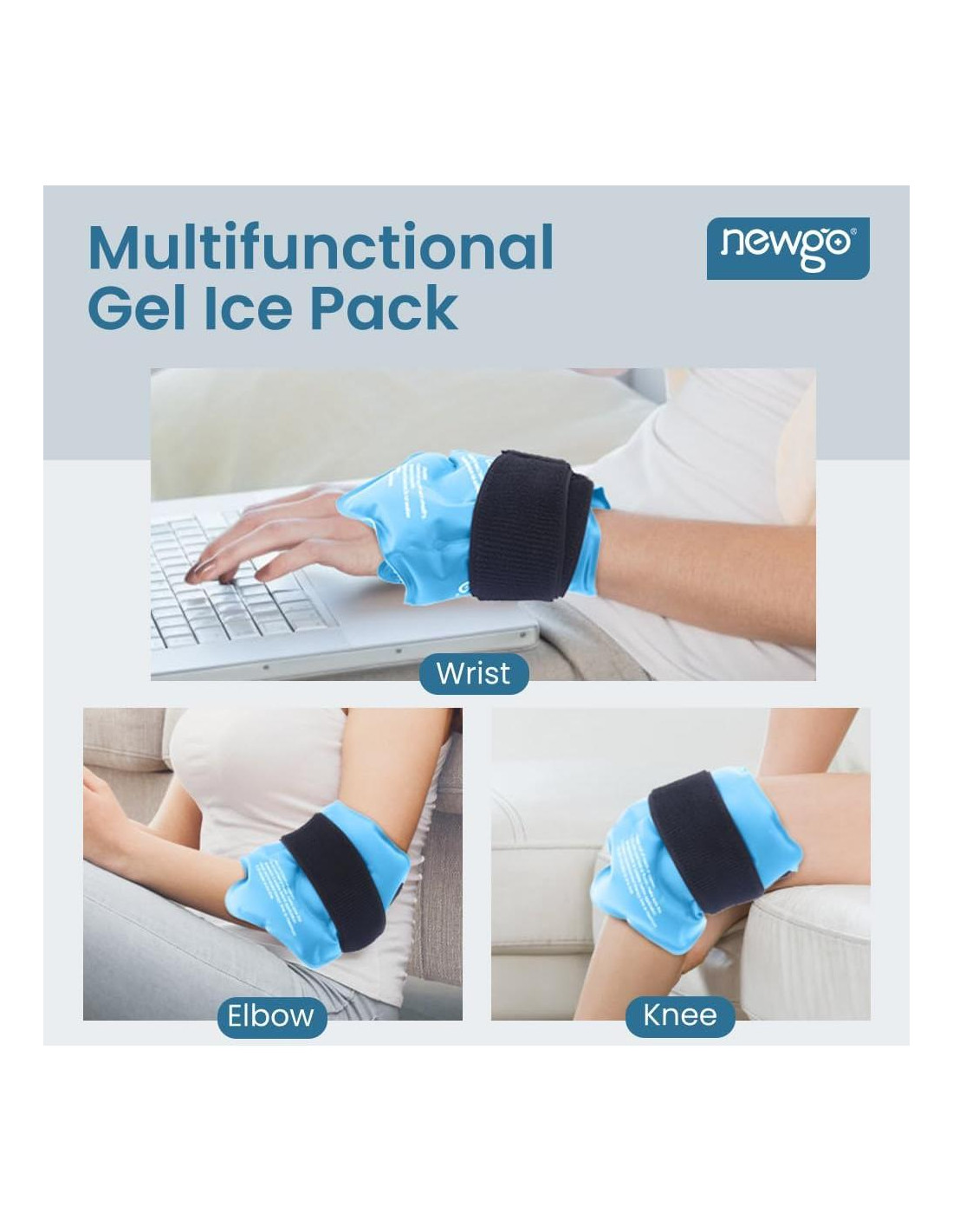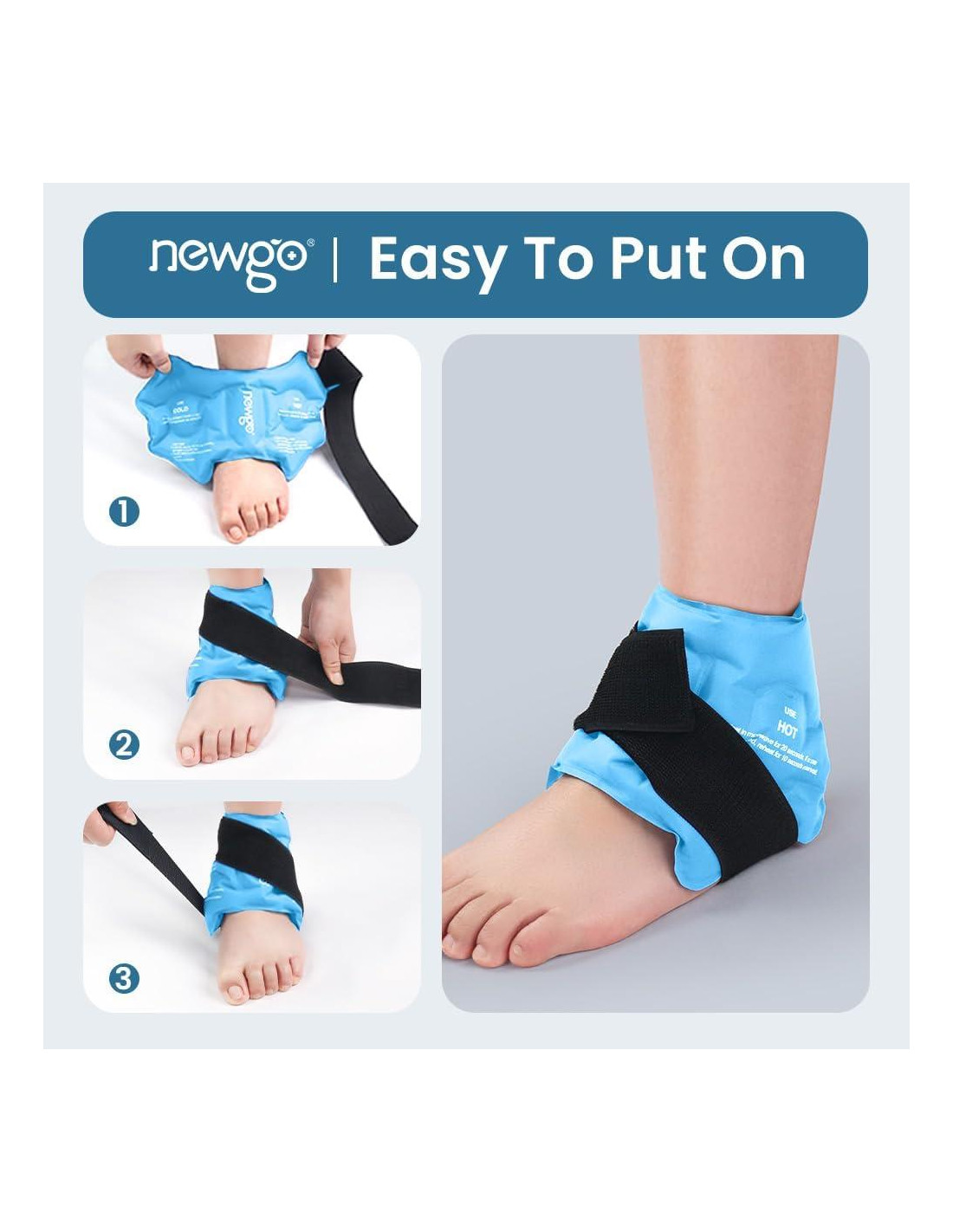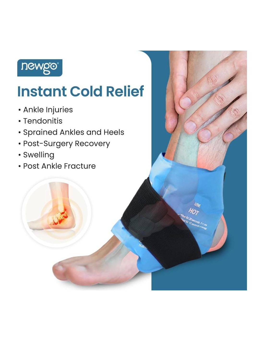 - Terapia Caliente Fría - La funda de hielo de gel para tobillo llena de gel de bajo punto de congelación, se mantiene flexible incluso después de congelarse a 0F (-18C). Colocar la funda de hielo en la bolsa de almacenamiento complementaria para congelar durante al menos 2 horas para terapia fría o calentar la funda de hielo en el microondas durante 20 segundos para terapia caliente. Uso limitado de calor o frío en el área afectada por no más de 20 minutos a la vez.
