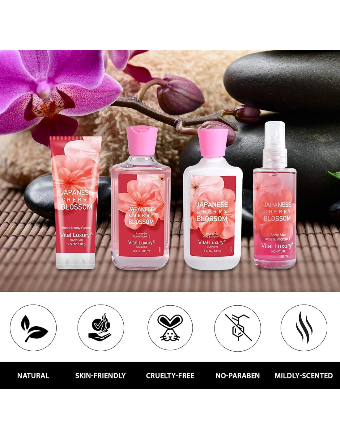- El gel de ducha y la crema corporal también cuentan con aroma de flor de cerezo japonés, dejando la piel suave, lisa y delicadamente perfumada