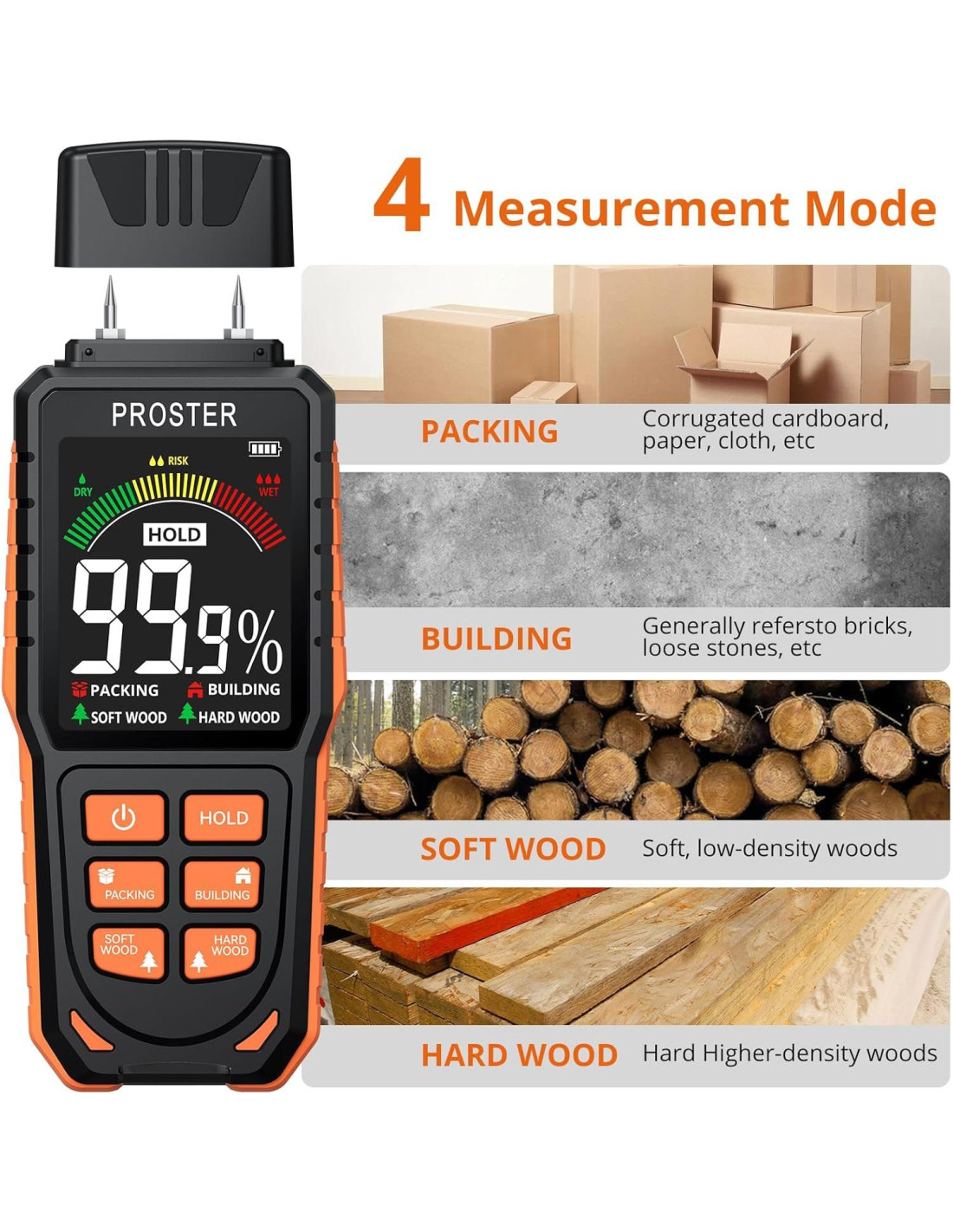 - Selección de Modo de Material Inteligente --- Con Pantalla de Color Fácil de Leer y Modos 'MADERA BLANDA' o 'MADERA DURA', este Medidor de Humedad para Madera se Adapta a la Densidad del Material, Ofreciendo Lecturas Confiables para Troncos, Pisos y Más
