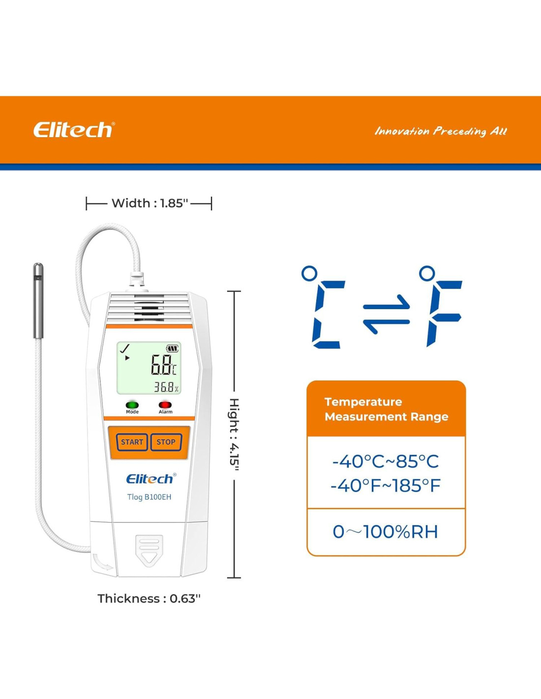 - Tecnología Inalámbrica Emparejamiento con un clic, programar/gestionar el registrador de forma remota a través de la aplicación Elitech dentro de rangos de metros.