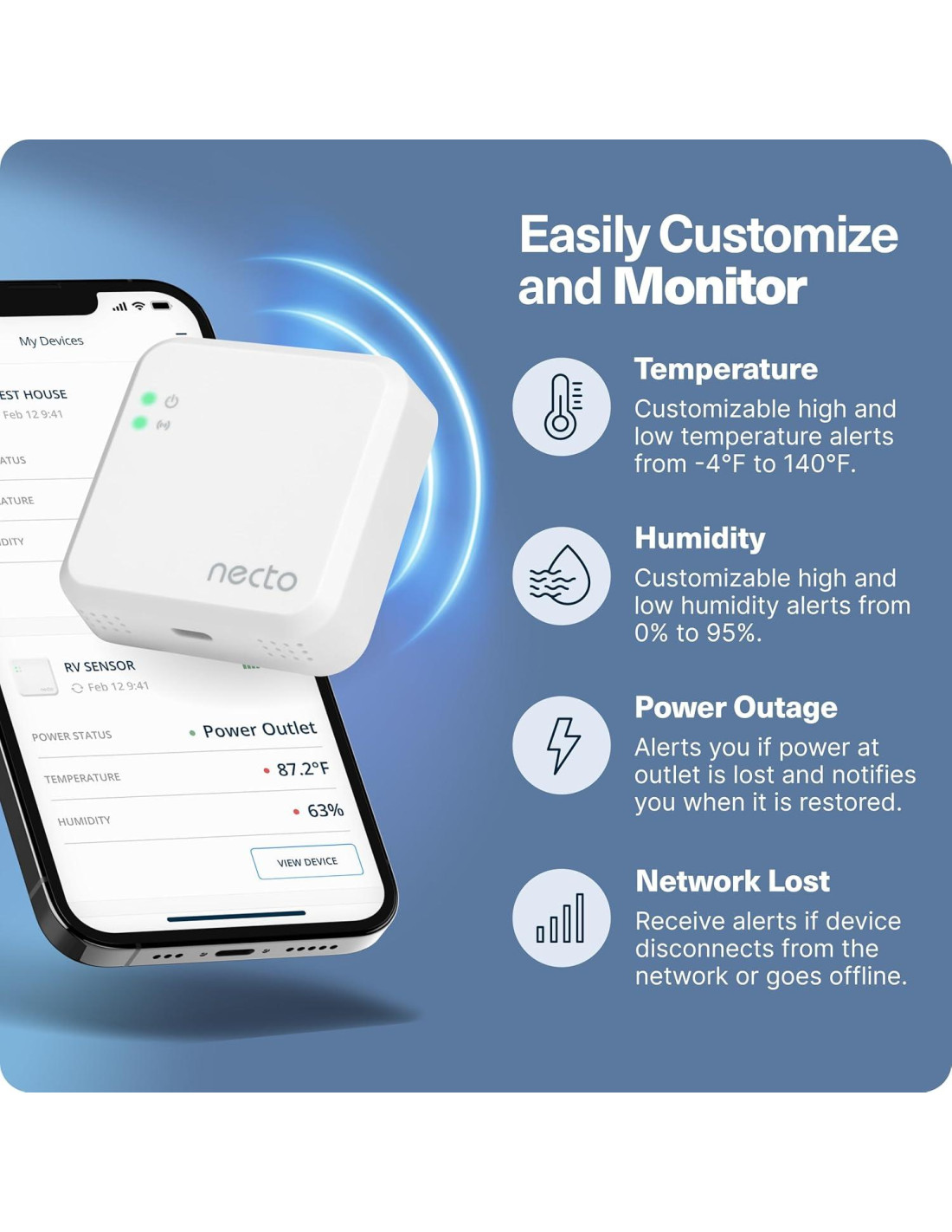 - BATERÍA INTERNA RECARGABLE - El monitor inteligente Necto para RV y Mascotas tiene una batería recargable de larga duración de 3 días. A diferencia de los sensores WiFi, Necto proporciona monitoreo continuo en caso de un corte de energía, a través de su batería incorporada y tecnología celular. Recibe alertas instantáneas en tu teléfono cuando la energía de la batería es baja o si el dispositivo se desconecta de la red.