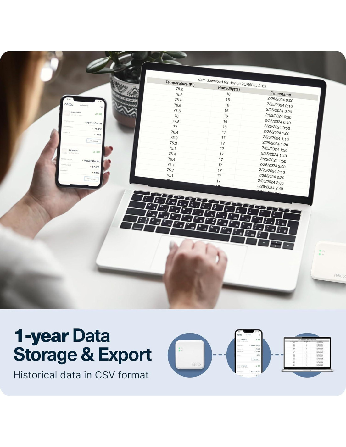 Libérate de las limitaciones del WiFi. Necto opera utilizando la red celular nacional a través de su tarjeta SIM 4G LTE incorporada. Agrega hasta 5 contactos para recibir notificaciones instantáneas por texto y correo electrónico si ocurren cambios críticos en la temperatura, humedad o estado de energía. Accede a nuestro portal en línea fácil de usar en tu teléfono móvil o PC. Visualiza las últimas lecturas, personaliza alertas y gestiona la configuración del dispositivo. Usa el soporte adhesivo de pared incluido para montar fácilmente el sensor en la pared. O simplemente colócalo plano sobre cualquier superficie. Cada 10 minutos se actualizan las lecturas en el panel de control. Las lecturas históricas se almacenan durante 1 año y se pueden descargar como un archivo CSV. La batería interna proporcionará energía durante 72 horas. Esto permitirá un monitoreo continuo en caso de un corte de energía.