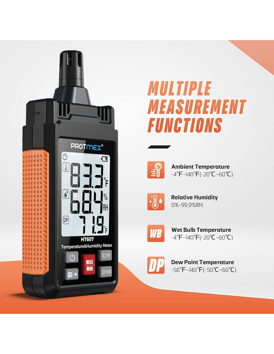 - [MÚLTIPLES MODOS DE MEDICIÓN] 4 modos de medición profesional: temperatura ambiente, humedad relativa, temperatura de bulbo húmedo y temperatura de punto de rocío. Elige lo que desees.