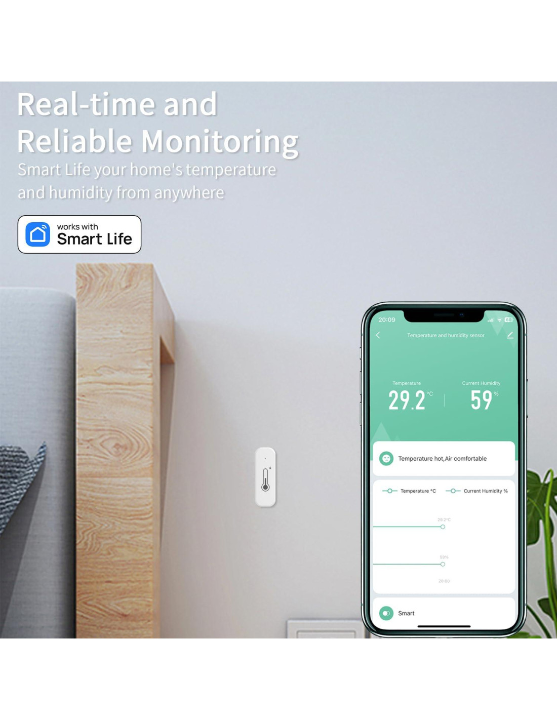 Mantente al tanto de los niveles de temperatura y humedad interior con este monitor WiFi inteligente. Sus sensores de alta precisión rastrean con exactitud las condiciones, permitiéndote monitorear de forma remota y recibir alertas a través de la aplicación TUYA. No se requiere hub para este conveniente dispositivo, que es compatible con Alexa y Google para una integración fluida en tu configuración de hogar inteligente. Con su diseño compacto y elegante, este termómetro e higrómetro se integran sin esfuerzo en cualquier habitación. Mantén el confort óptimo y protege tus pertenencias valiosas de daños por humedad con datos en tiempo real al alcance de tu mano.