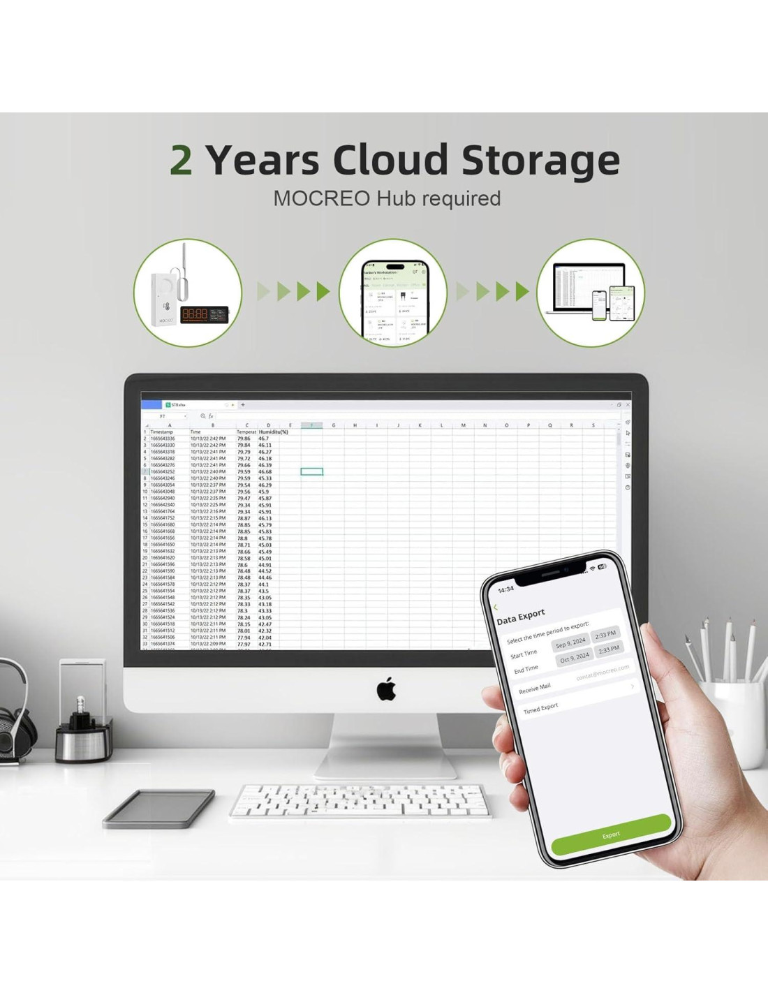 - Monitoreo Remoto: Usa con el Hub WiFi MOCREO H5-Lite (solo 2.4GHz) para monitorear de forma remota el congelador o refrigerador en tiempo real 24/7. Recibe notificaciones push de App y alertas por correo electrónico, exporta dos años de datos históricos (El Hub requiere actualización a v1.1.1)