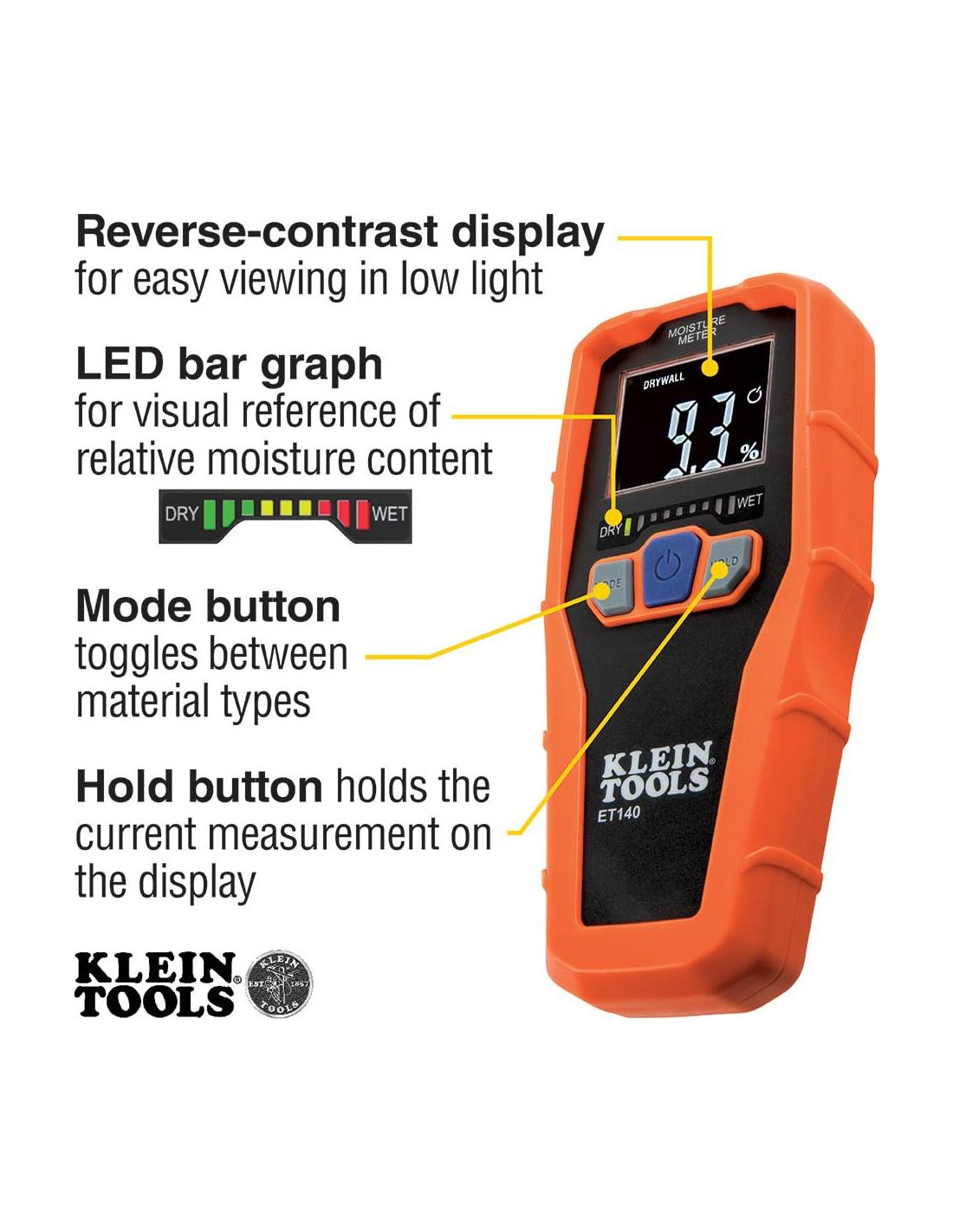El Medidor de Humedad Klein Tools ET140 está diseñado para detectar de manera no invasiva el contenido de humedad oculto hasta 3/4-Pulgada (1,91 cm) de profundidad. Seleccione fácilmente entre materiales con el botón de modo para probar la superficie de paneles de yeso, masonería, madera dura y madera blanda. El ET140 tiene una fácil visualización con una pantalla brillante de contraste inverso y un gráfico de barras LED. Durante más de 160 años, Klein Tools ha fabricado herramientas manuales de calidad premium y grado profesional que ofrecen el rendimiento, durabilidad y precisión necesarios para hacer el trabajo correctamente. Nuestra familia de ingenieros, trabajadores y artesanos continúa aportando seis generaciones de experiencia en cada herramienta que creamos utilizando solo los materiales de la más alta calidad, una mano de obra superior y manteniendo la fabricación lo más cerca de casa posible. Klein no es solo el nombre de nuestra empresa, también es el nombre de nuestra familia. Y dado que somos una empresa estadounidense de propiedad y gestión familiar, sabe que puede contar con nosotros para estar aquí mañana. Klein Tools no solo fabrica grandes productos, fabricamos grandes productos que soportan las demandas de los profesionales que los utilizan todos los días... Desde 1857.