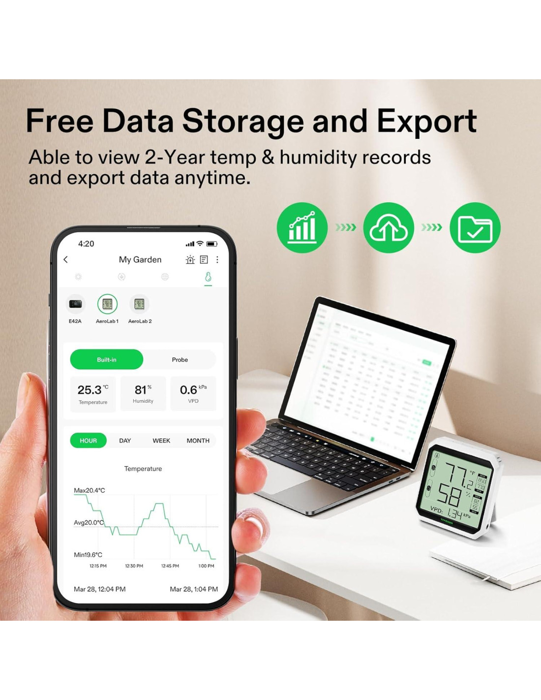 - Almacenamiento de Datos Gratuito por 2 Años: Este medidor de temperatura y humedad interior ofrece un servicio de almacenamiento de datos gratuito por 2 años, lo que le permite analizar los datos históricos de temperatura y humedad y hacer ajustes en consecuencia; También puede exportar los datos fácilmente en cualquier momento