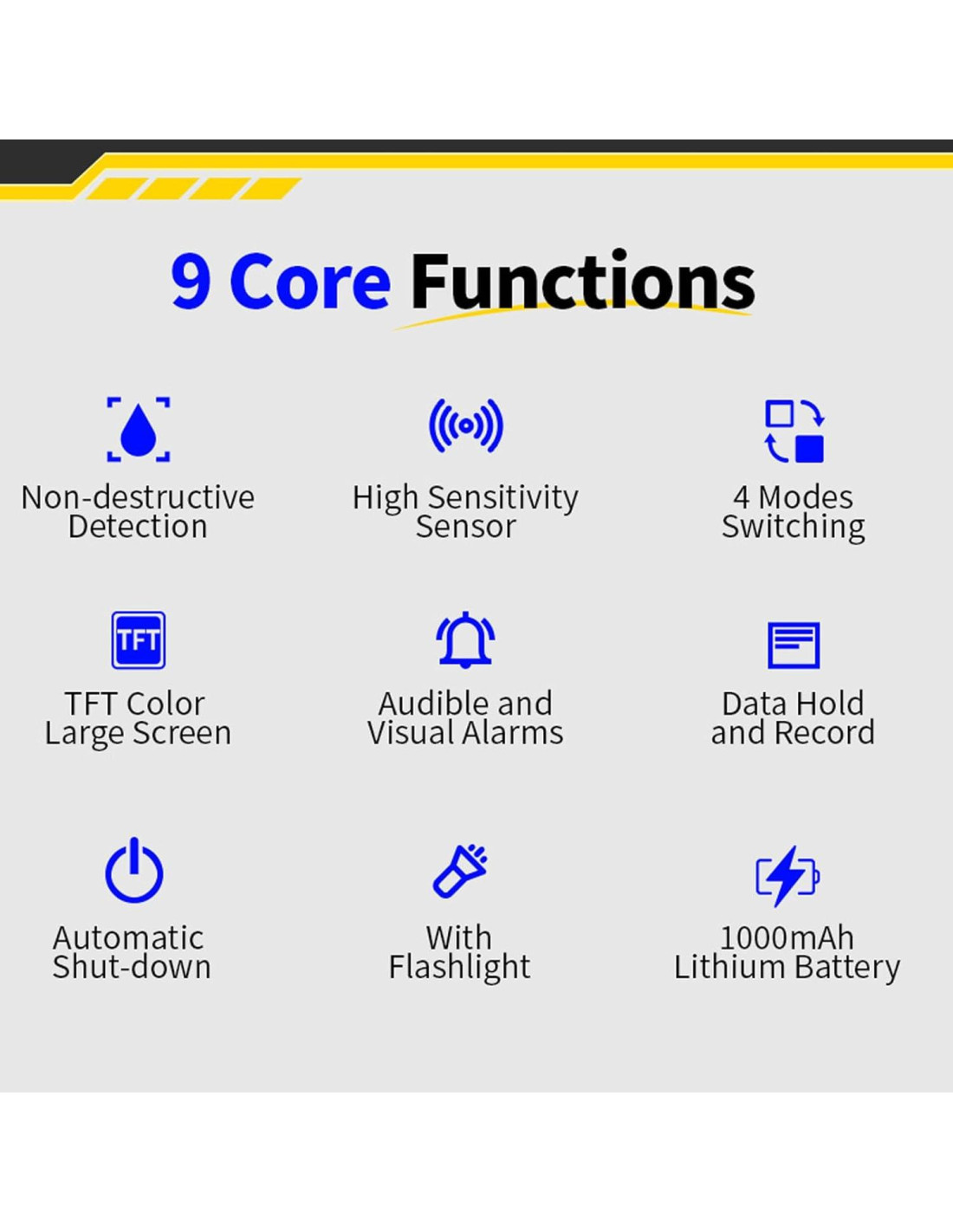 - Gestión de Datos Integral: Almacena y recuerda 30 conjuntos de mediciones directamente en este probador de humedad sin pin, eliminando la dependencia de registros externos. El sistema de memoria organizado permite un análisis comparativo de tendencias de humedad, mientras que características suplementarias como pantalla de temperatura incorporada, apagado automático configurable (5/10/15 mins) y capacidad de actualización de firmware mejoran la utilidad a largo plazo. La linterna integrada extiende la funcionalidad a espacios de trabajo con poca luz.