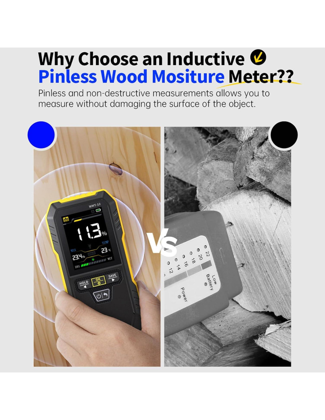 - Rango de Medición Versátil: Este medidor de humedad de madera cubre sin esfuerzo un amplio espectro de 0% a 75%, lo que lo hace ideal para diversos materiales como paredes de yeso (0-25%), paredes de ladrillo (0-43%), madera blanda (0-75%) y madera dura (0-65%). Su capacidad de prueba no destructiva asegura que no haya daños en las superficies mientras proporciona lecturas de humedad confiables en diversas aplicaciones. El diseño sin pin mejora la usabilidad, eliminando la necesidad de sondas invasivas.