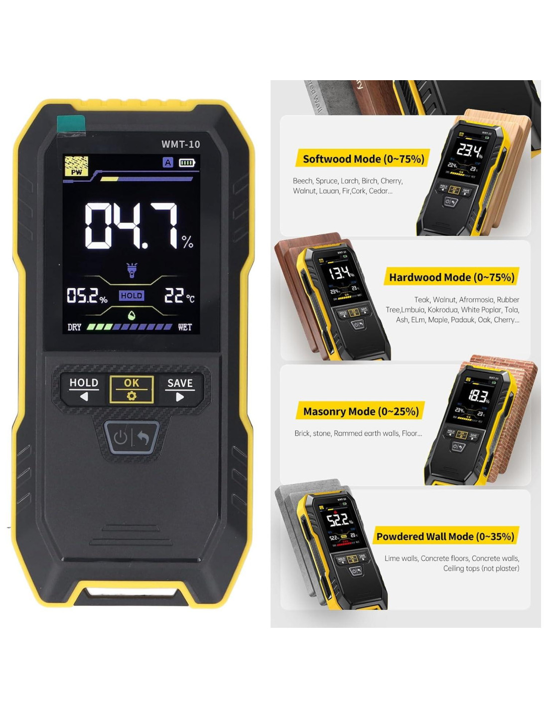 Disfruta de una medición de alta precisión con una resolución de 0.1% y una profundidad de medición de hasta 17mm para lecturas precisas de varios materiales. Este medidor de humedad de madera ofrece mediciones completas de 0% a 75%, adecuado para pared de yeso, pared de ladrillo, madera blanda y madera dura. Guarda y visualiza hasta 30 conjuntos de datos de medición directamente en el dispositivo, lo que facilita la gestión y análisis de las lecturas de humedad. Cuenta con linterna incorporada para entornos de poca luz, pantalla de temperatura, configuraciones de apagado automático, ajuste de brillo y sonido, y actualización de firmware. La pantalla color de 2.4 pulgadas proporciona una visualización clara y vívida para una fácil lectura de los resultados de medición. Con recordatorios sonoros y visuales, serás notificado cuando la humedad supere el umbral de seguridad, protegiendo tus materiales de daños.