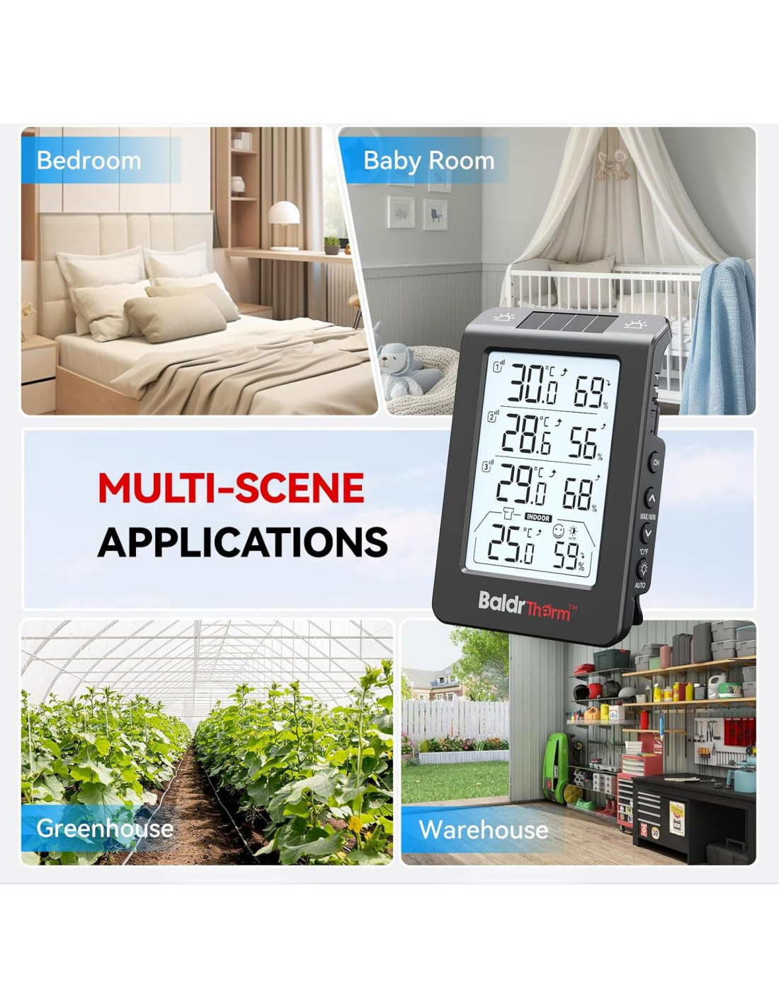 - Monitorea Múltiples Ubicaciones a la Vez: Visualiza lecturas de temperatura y humedad de cuatro ubicaciones diferentes en una sola pantalla, todo sin necesidad de cambiar entre configuraciones. Ideal para grandes áreas exteriores, este termómetro te permite mantener un control sobre múltiples zonas simultáneamente con facilidad.