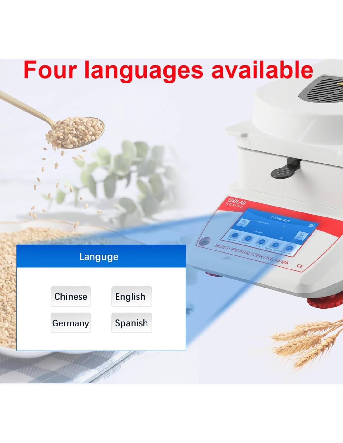 - Funcionalidad Inteligente: El analizador de humedad te permite preestablecer y almacenar hasta 32 grupos de métodos de investigación para una medición rápida y fácil. Puede conectarse RS232 a una impresora o computadora para exportar los datos. Además, esta máquina tiene cuatro idiomas diferentes (Inglés, Alemán, Español y Chino). Consejo: Se requiere calibración con pesos antes de la prueba. (Pesos de calibración incluidos)