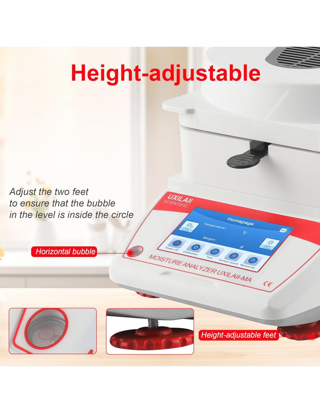 - Super Calidad: Estamos comprometidos a ofrecer solo equipos profesionales. Puede ser utilizado en alimentos, agricultura, química, medicina y otras industrias de producción y monitoreo de calidad. Es por eso que nuestro analizador de humedad inteligente está hecho con materiales de alta calidad, teniendo un recinto de aluminio y una cámara de calentamiento de varios niveles para un uso seguro y duradero.