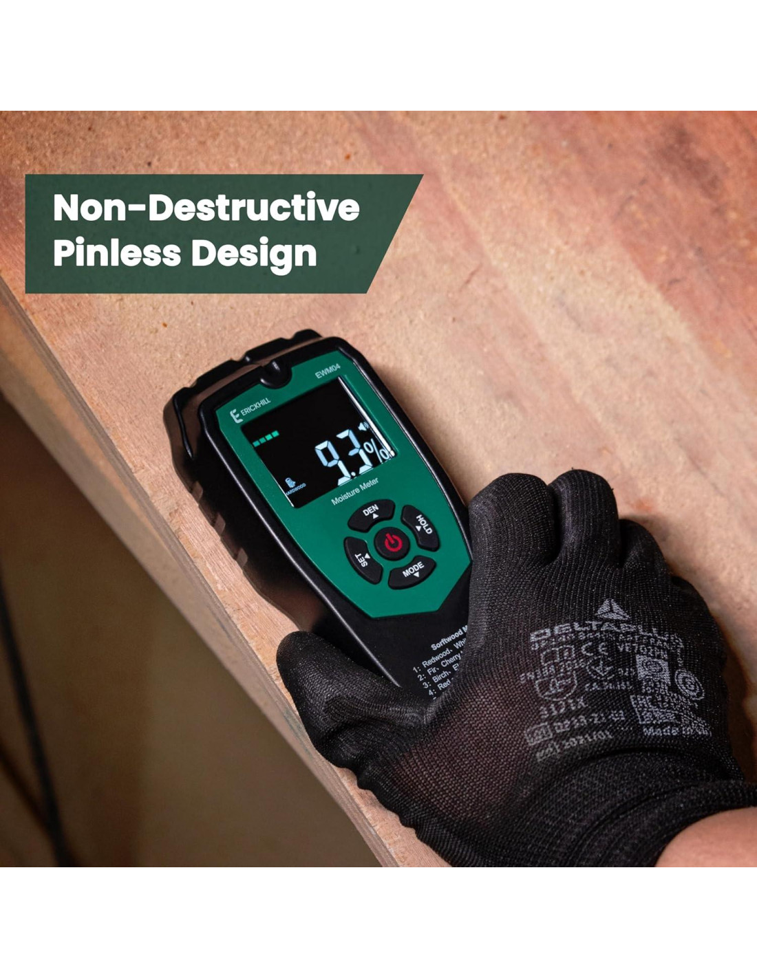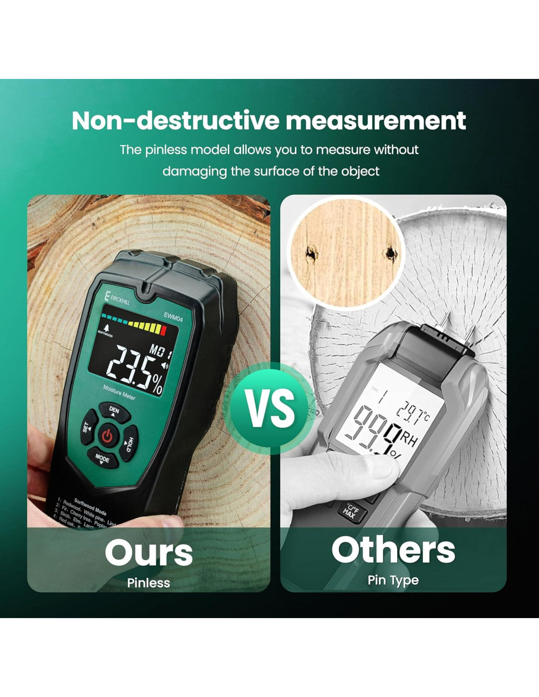 Detector de humedad para madera, paredes, leña, ladrillos, madera, piso ERICKHILL se compromete a producir medidores profesionales y de alta calidad. El paquete incluye: El poder se apaga automáticamente después de aproximadamente 15 minutos sin ninguna operación de botón. Cuando el valor medido es estable, presione brevemente 'Hold' para bloquear la pantalla actual de contenido de agua. Mantenga presionado 'DEN' para encender o apagar el zumbador. Cuando el contenido de humedad alcanza o supera la alarma establecida, el zumbador sonará.
