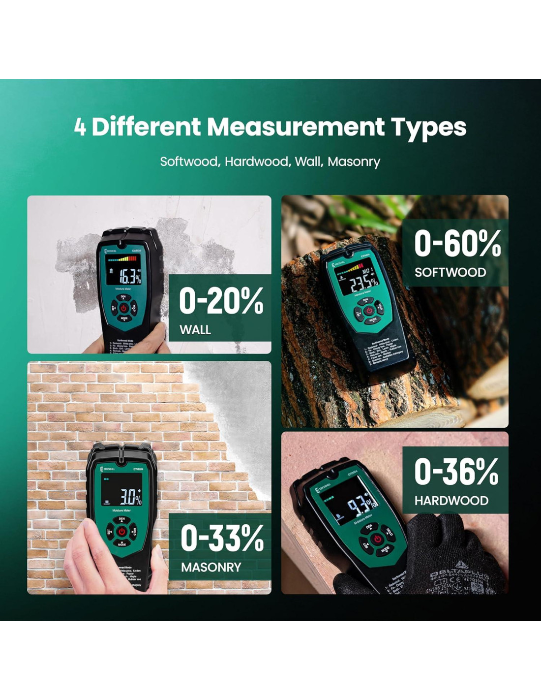 - [El rango de medición es: Madera blanda: 0%~60%; 0%~36% Madera dura; 0%~96% Pared y 0%~100% Masonería. La precisión es +/-4% (Madera blanda y dura)]