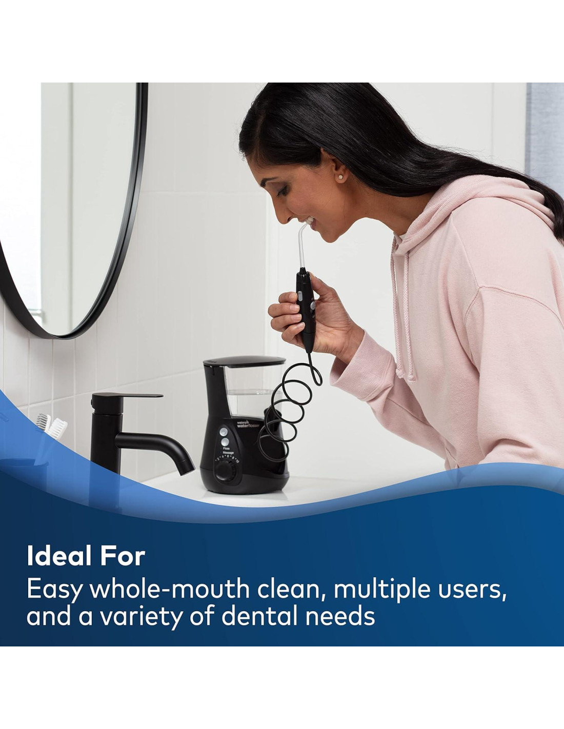 - Reemplaza el cepillado y el uso de hilo dental entre los dientes y debajo de la línea de las encías; mejora la salud de las encías hasta un 50% más que el hilo dental