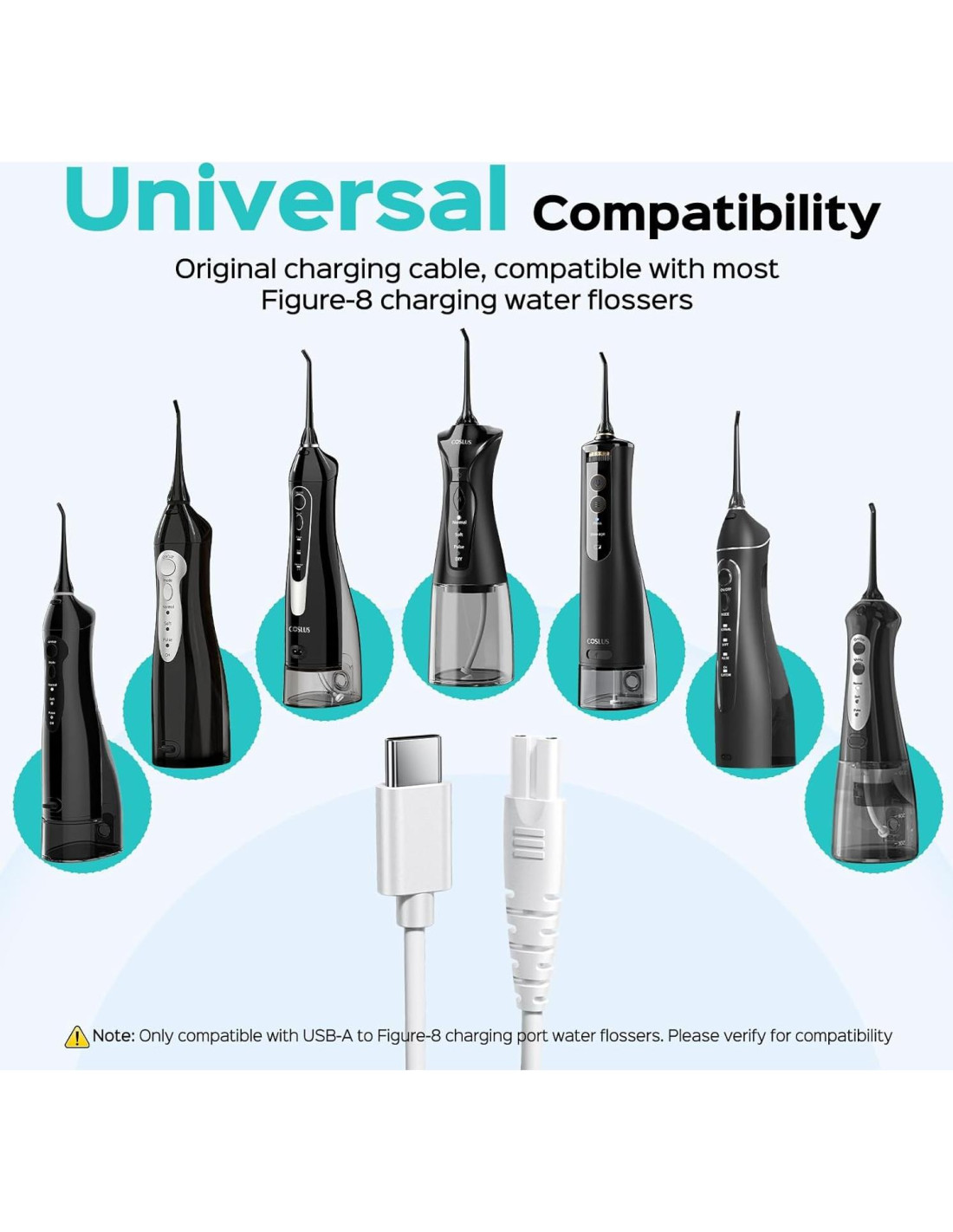 - Por Favor Tenga en Cuenta: Este cable de carga para hilo dental a presión es compatible solo con modelos específicos que cuentan con un puerto de carga de 8 pines. Si la compatibilidad no se menciona en la página de detalles, recomendamos contactar al soporte de COSLUS para confirmación.