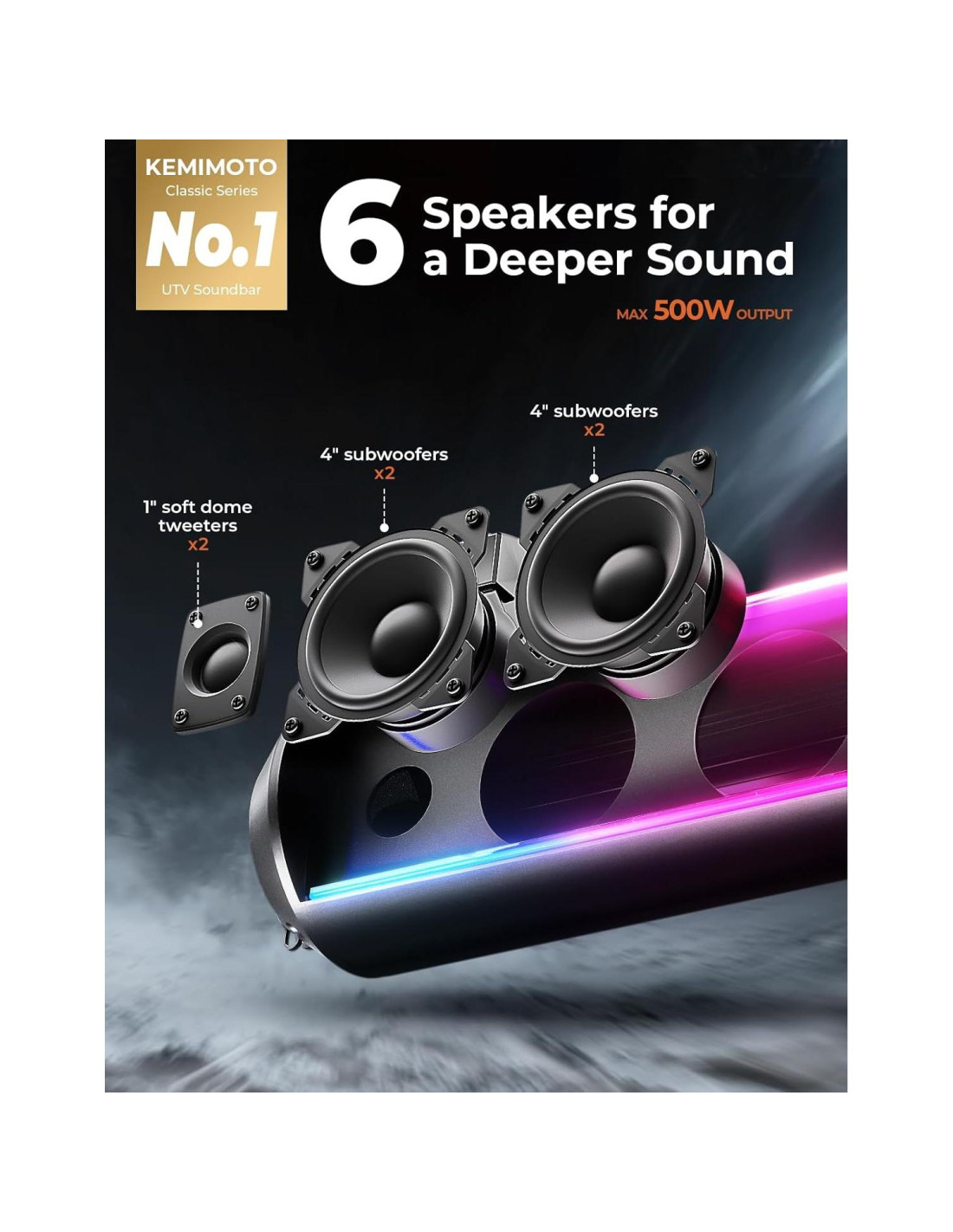- Escucha Más Bajo Profundo: ¿Buscas una barra de sonido UTV de alto volumen para un paseo emocionante? No busques más que la barra de sonido RGB de KEMIMOTO. Equipado con cuatro subwoofers de 4'' y dos tweeters de 1'', junto con un amplificador clase A/B incorporado, la robusta barra de sonido kemimoto ofrece un sonido estéreo inmersivo incluso a altas velocidades en la carretera.