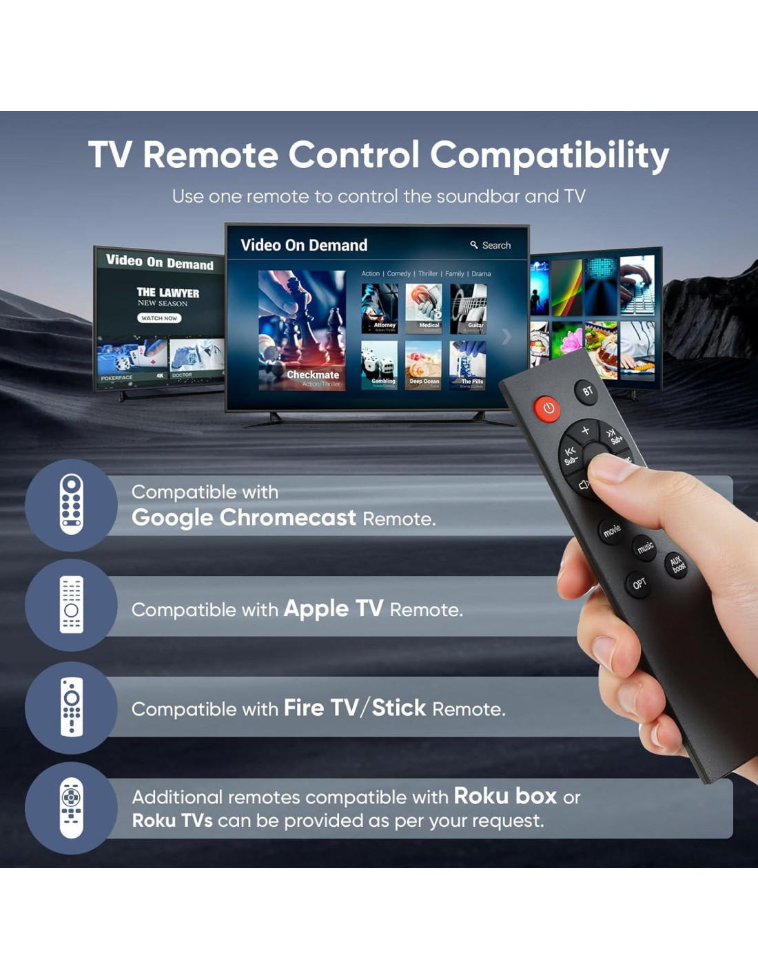- Experiencia de Control Remoto Unificada Esta barra de sonido para TV es compatible con Fire TV/Stick, Google Chromecast y controles remotos de Apple TV, permitiéndote controlar tanto tu barra de sonido para TV inteligente como el contenido de streaming con un solo controlador. Controles remotos adicionales compatibles con Roku box o TVs Roku pueden ser proporcionados a solicitud.