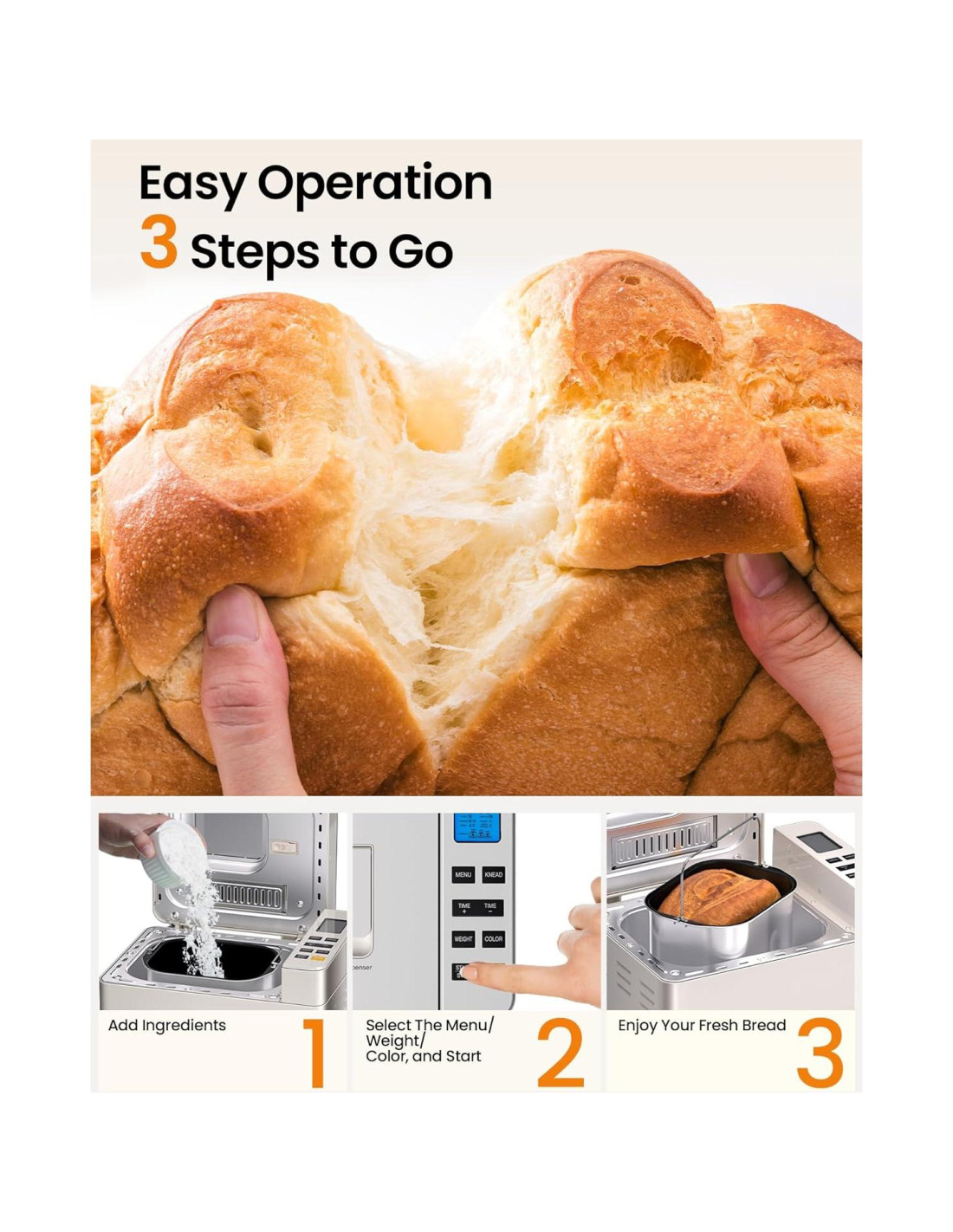 - Personaliza tu Pan Ideal: Personaliza tu pan con 25 opciones de horneado como Trigo Integral, Sin Gluten, Pastel y Mermelada. Elige tamaños de pan (1/1.5/2lb) y color de corteza (Claro/Medio/oscuro) para crear pan de calidad de panadería directamente en tu cocina