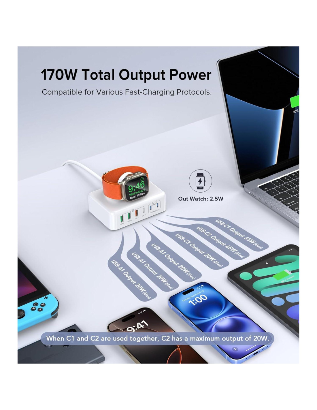- [Estación de Carga Rápida USB C] Este es un moderno cargador USB C de múltiples puertos que puede cargar simultáneamente 6 dispositivos. El puerto USB C1/USB C2 puede entregar hasta 65W, y solo toma 2.5 horas cargar completamente un MacBook Pro de 16" (40,64 cm). Al usar USB C1 y USB C2 al mismo tiempo, USB C2 entrega 20W Max, carga super rápida para tu teléfono. USB C3 (Max 20W, PD3.0) y 3 x USB A (Max 18W, QC3.0) aseguran el mejor efecto de carga para teléfonos móviles, relojes, auriculares.