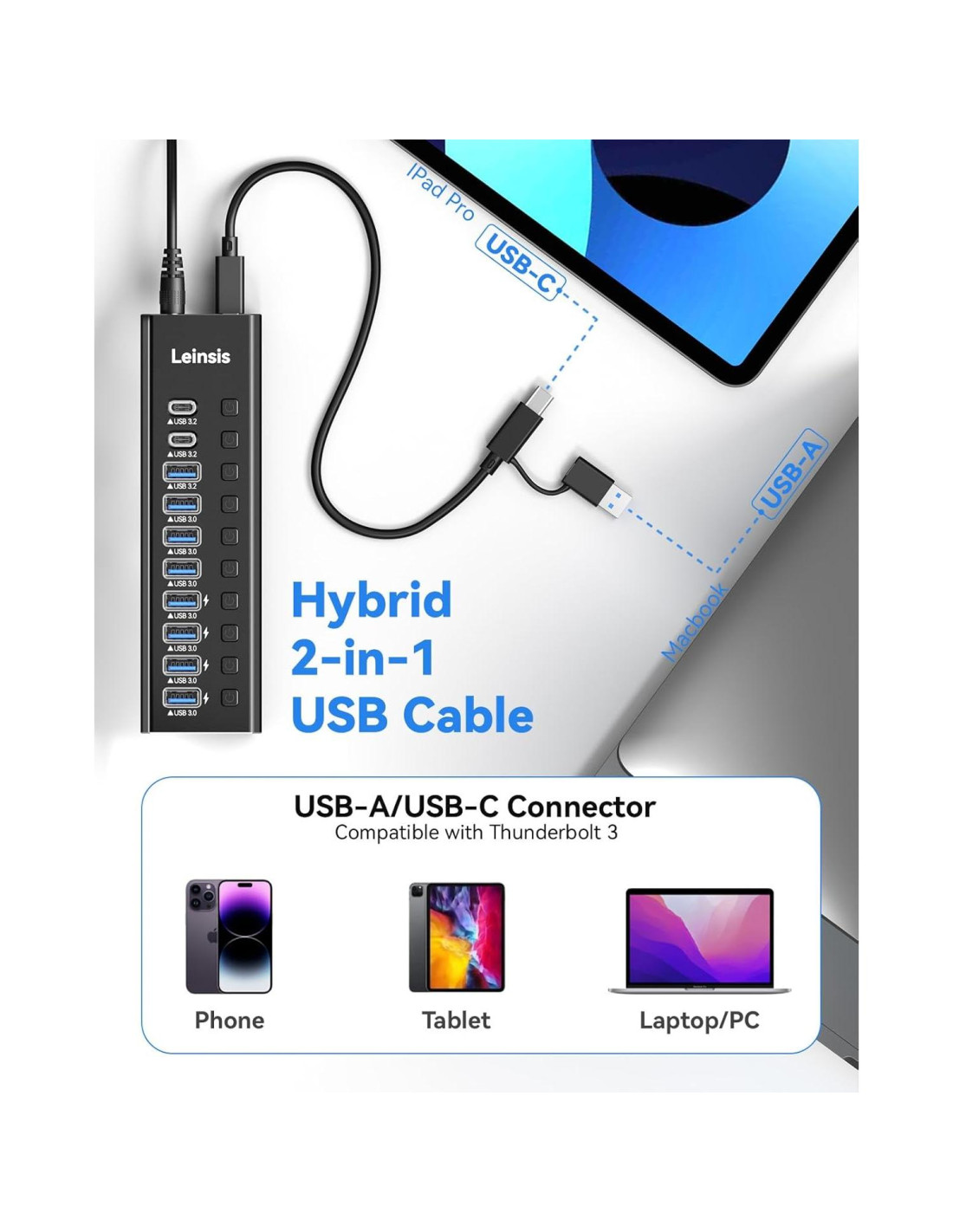 - [Hub USB alimentado híbrido] Di adiós a los puertos limitados. El hub USB 3.2 alimentado de 10 puertos LEINSIS agrega instantáneamente puertos USB-A 3.2 de 10Gbps, 2 puertos USB-C 3.2 y 7 puertos USB-A 3.0 a tu laptop, escritorio, host de juegos y más. Es completamente plug and play sin necesidad de controladores