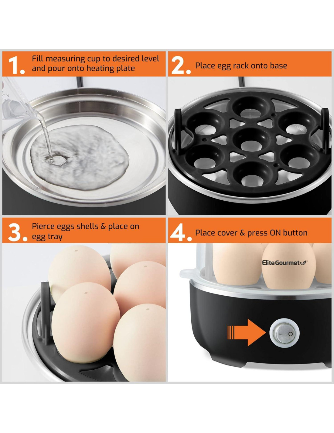 - VERSATILIDAD: Ya sea combinando con tostadas de aguacate o preparando huevos endiablados, el Cocedor de Huevos Fácil Elite Gourmet es un hervidor de huevos todo en uno, vaporera de verduras o alimentos, ¡y más!