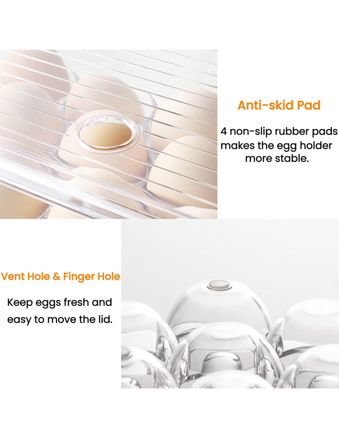 - Almohadillas Antideslizantes y Diseño Apilable: Hay 4 almohadillas antideslizantes en la parte inferior, lo que hace que el contenedor de almacenamiento de huevos sea más estable. Las bandejas de huevos se pueden apilar en el refrigerador o encimera para maximizar el espacio de almacenamiento.
