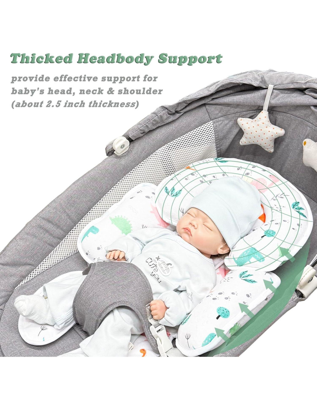 - Cojín reversible: El cojín de soporte para cabeza y cuerpo del bebé está hecho de poliéster suave y malla 3D transpirable para una efectiva calidez y disipación del calor, y diseño de uso dual, puede ser utilizado en todas las estaciones