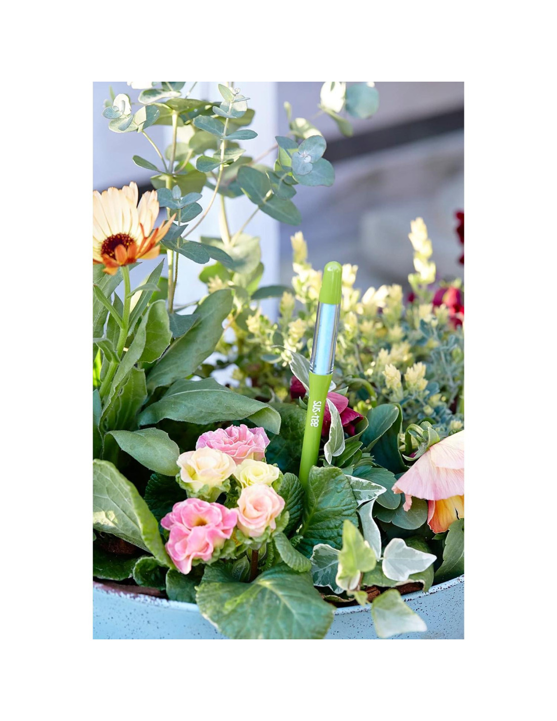 Extiende la vida de tus queridas plantas de interior con el medidor de humedad del suelo SUSTEE Aquameter para plantas de interior y exterior. SUSTEE está diseñado y fabricado en Japón y es la adición perfecta para varias plantas de interior. Tiene una estética delgada y minimalista que no resta belleza a las plantas, integrándose armoniosamente cuando se deja en el suelo. Funciona con casi cualquier planta que crezca en el suelo. Al usar el palo de prueba de humedad, el color blanco indica que la planta necesita riego, y el color azul indica que tiene suficiente agua. El núcleo central que determina si se necesita riego también se puede reemplazar manualmente. Este medidor de humedad del suelo que se deja en la tierra no requiere mantenimiento. Un indicador perfecto de riego para plantas en macetas. Se recomienda reemplazar el núcleo recargable de tu SUSTEE después de 6-9 meses de uso. SUSTEE ha ganado múltiples premios internacionales, incluyendo el Premio Reddot de Diseño, el Premio de Diseño de Alemania para Asia, y el Premio de Buen Diseño de Japón. El tamaño grande está destinado para tamaños de macetas de 6 - 12. Se incluyen cinco varillas. Color: verde. SUSTEE es un sensor de humedad del suelo moderno y japonés. El color azul indica que hay suficiente agua en el suelo, y el color blanco indica que la planta necesita riego. SUSTEE presenta una estética mínima que no resta belleza a tus plantas. ¿Tu SUSTEE se ha vuelto blanco? ¡Eso significa que es hora de regar! Después de regar, el inserto blanco cambiará a un color azul. Esto indica que hay suficiente agua en el suelo. SUSTEE se puede usar con casi todas las plantas que crecen en suelos con un cierto nivel de retención de humedad. Esto incluye suelo akadama, tierra negra, corteza, coco peat, musgo de turba y vermiculita. Al insertar SUSTEE, asegúrate de que la marca que se encuentra en el palo esté completamente cubierta. También asegúrate de que la abertura de transpiración sea visible si el palo necesita ir más profundo. El tiempo que tarda en cambiar de color dependerá de la cantidad de agua dada y del nivel de retención de agua. Al usar SUSTEE por primera vez, riega generosamente. El palo pequeño tarda aproximadamente 3 minutos, el mediano 15 minutos, y el grande 25 minutos.