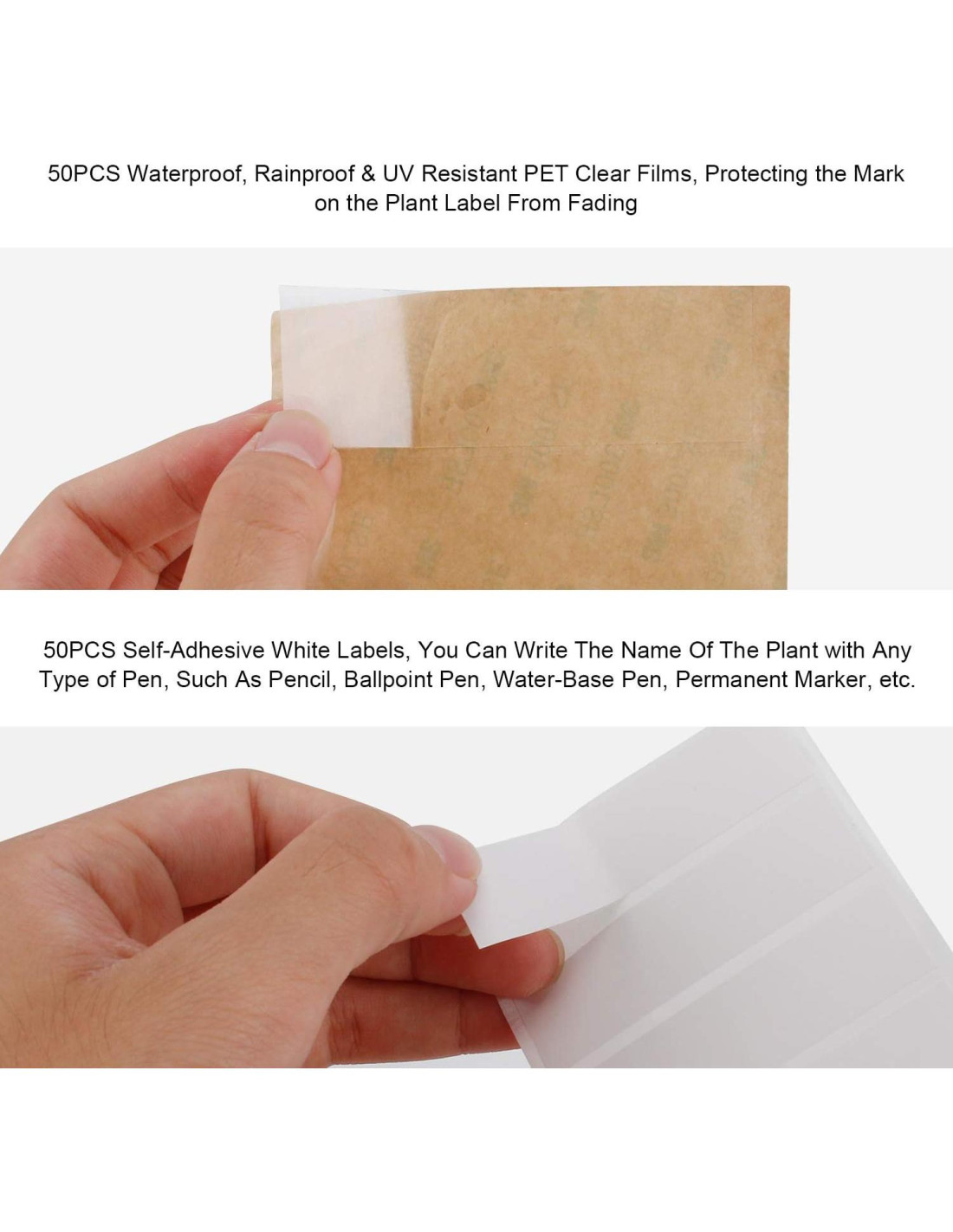 - Protección y Retención de Marcado - Viene con 50 etiquetas de escritura autoadhesivas blancas y 50 películas transparentes de PET, se puede usar para proteger su marca escrita. Puede escribir en las etiquetas blancas con cualquier tipo de bolígrafo, como lápices, bolígrafos a base de agua, bolígrafos de bola, marcadores de tinta permanente y más. La película transparente protege la marca de ser lavada por la lluvia y tiene un fuerte efecto de protección solar, lo que puede prevenir efectivamente que la marca se desvanezca debido al tiempo o problemas climáticos.