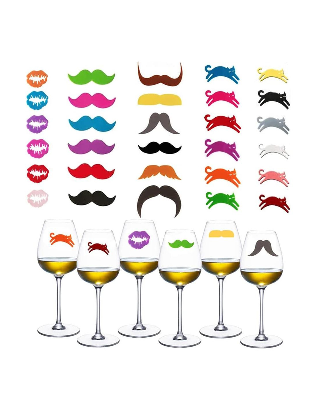 - Juego de Encantos de Vino de 30 Pcs: el paquete incluye 30 marcadores de copas de vino en diferentes estilos: 6 x Huella de Labio + 12 x Huella de Bigote + 12 x Huella de Gato; te ayuda a distinguir tu bebida de las demás, para que puedas disfrutar plenamente de las horas felices