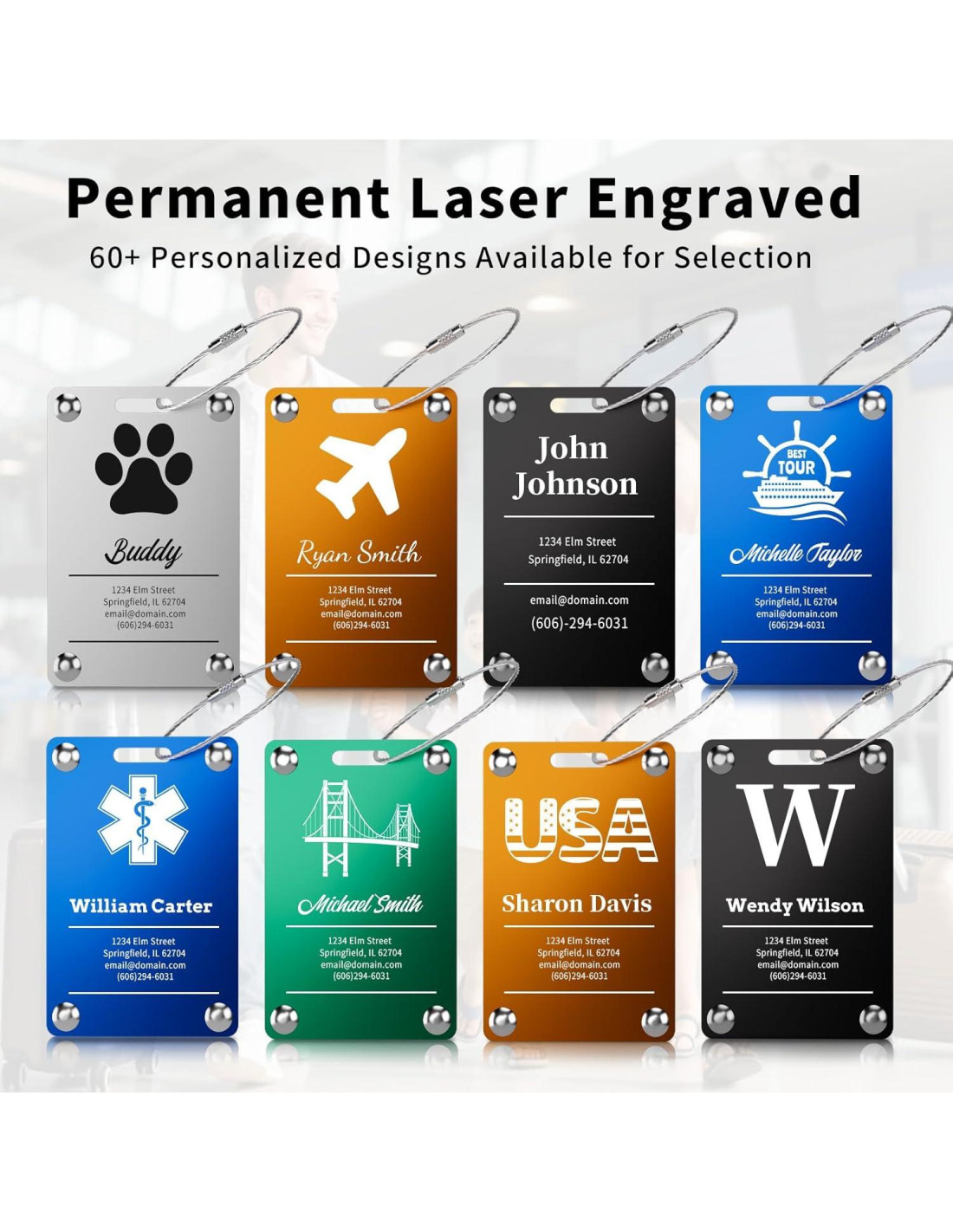 - Identificación Clara: Cada etiqueta presenta letras grabadas con láser que ofrecen un fuerte contraste y legibilidad duradera. Ya sea en el aeropuerto, en un crucero o viajando con un grupo, estas etiquetas de equipaje personalizadas para maletas te ayudan a identificar rápidamente tus bolsas sin confusión.