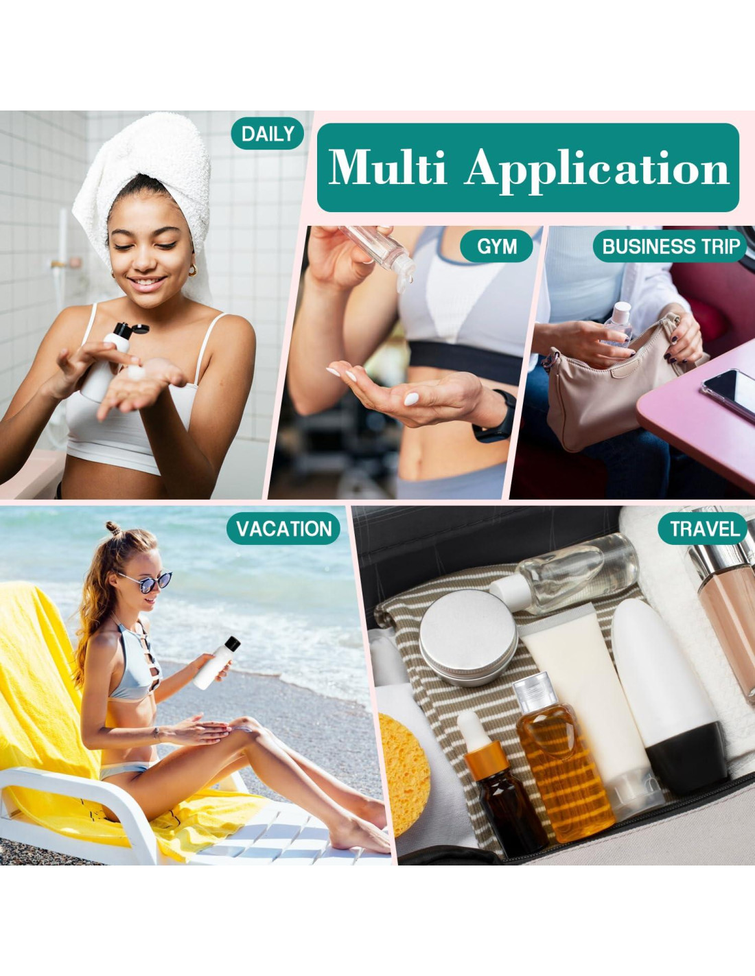- [Multiuso] - Estas botellas vacías de tamaño de viaje son perfectas para vacaciones, viajes de negocios, playa, camping, regalos de fiesta, y pueden almacenar líquidos y artículos de tocador como champú, acondicionador, loción, protector solar, cosméticos.