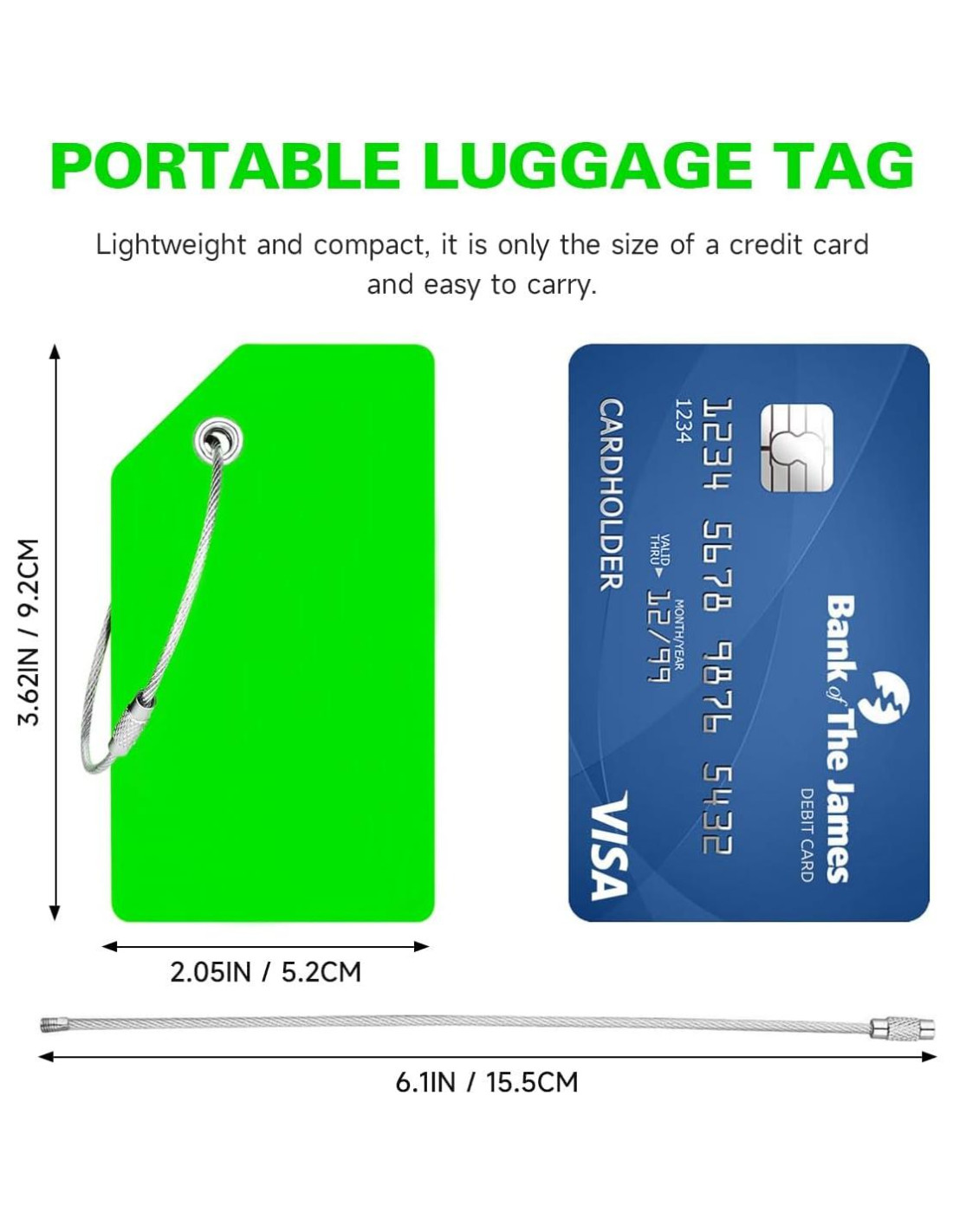 - Compacto y Ligero: Estas etiquetas de equipaje miden solo 2.05 x 3.62 pulgadas (5.2 x 9.2 cm) y cuentan con un anillo de acero de 0.08 x 6.1 pulgadas (0.2 x 15.5 cm). Son ligeras y fáciles de asegurar, lo que las convierte en una opción ideal para los viajeros en movimiento.