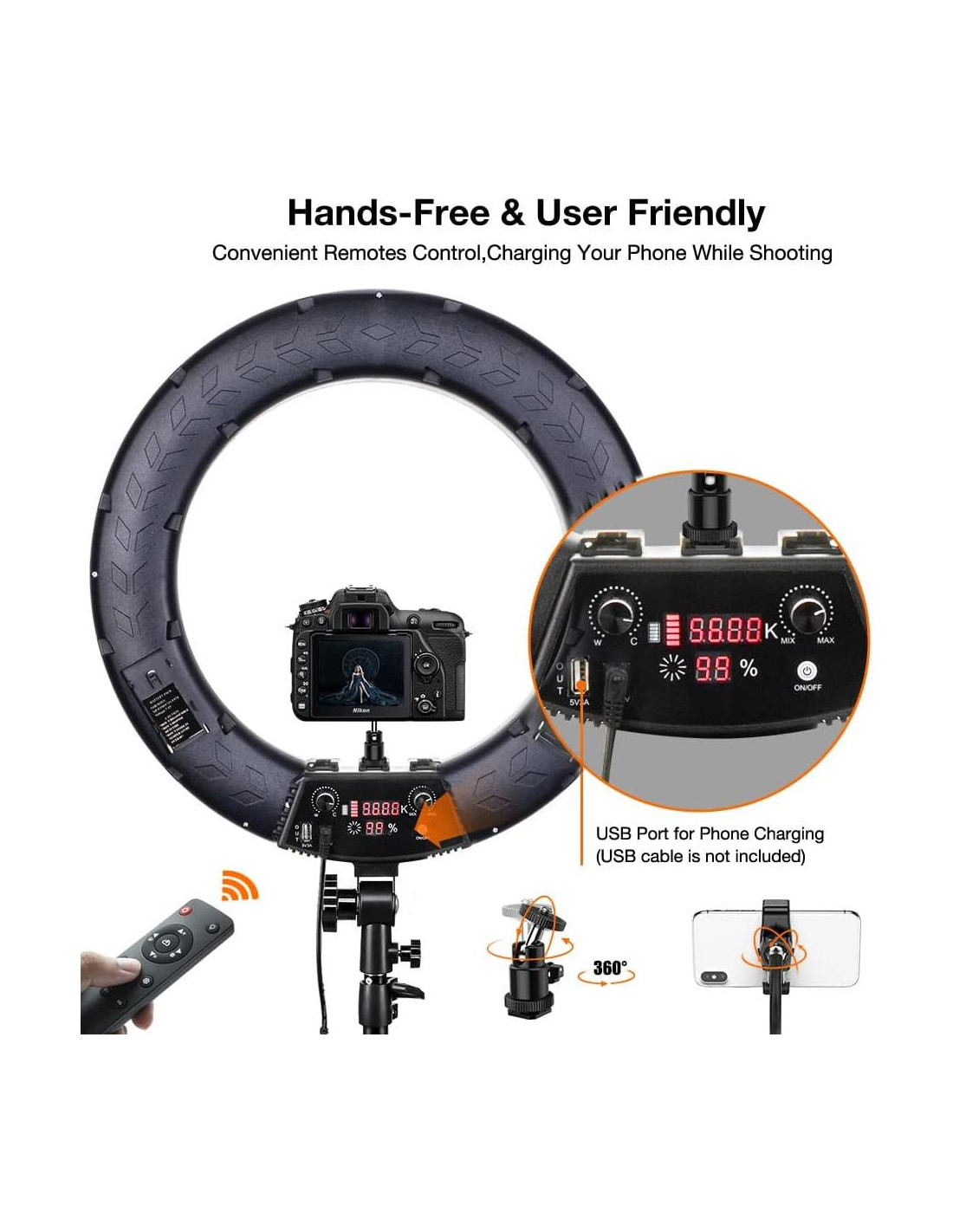 - Carga de teléfono y uso al aire libre - La Luz de Anillo LED INKELTECH resolvió el problema de que tu teléfono se quede sin batería cuando estás transmitiendo en vivo. Puedes cargar tu teléfono a través del puerto USB en la parte posterior del anillo mientras estás grabando videos. Brinda más comodidad para tu grabación. Puedes alimentar tu Luz de Anillo conectándola en interiores. Alternativamente, si necesitas usarla al aire libre, puedes alimentar tu Luz de Anillo INKELTECH al aire libre con baterías (solo baterías SONY; no incluidas)!