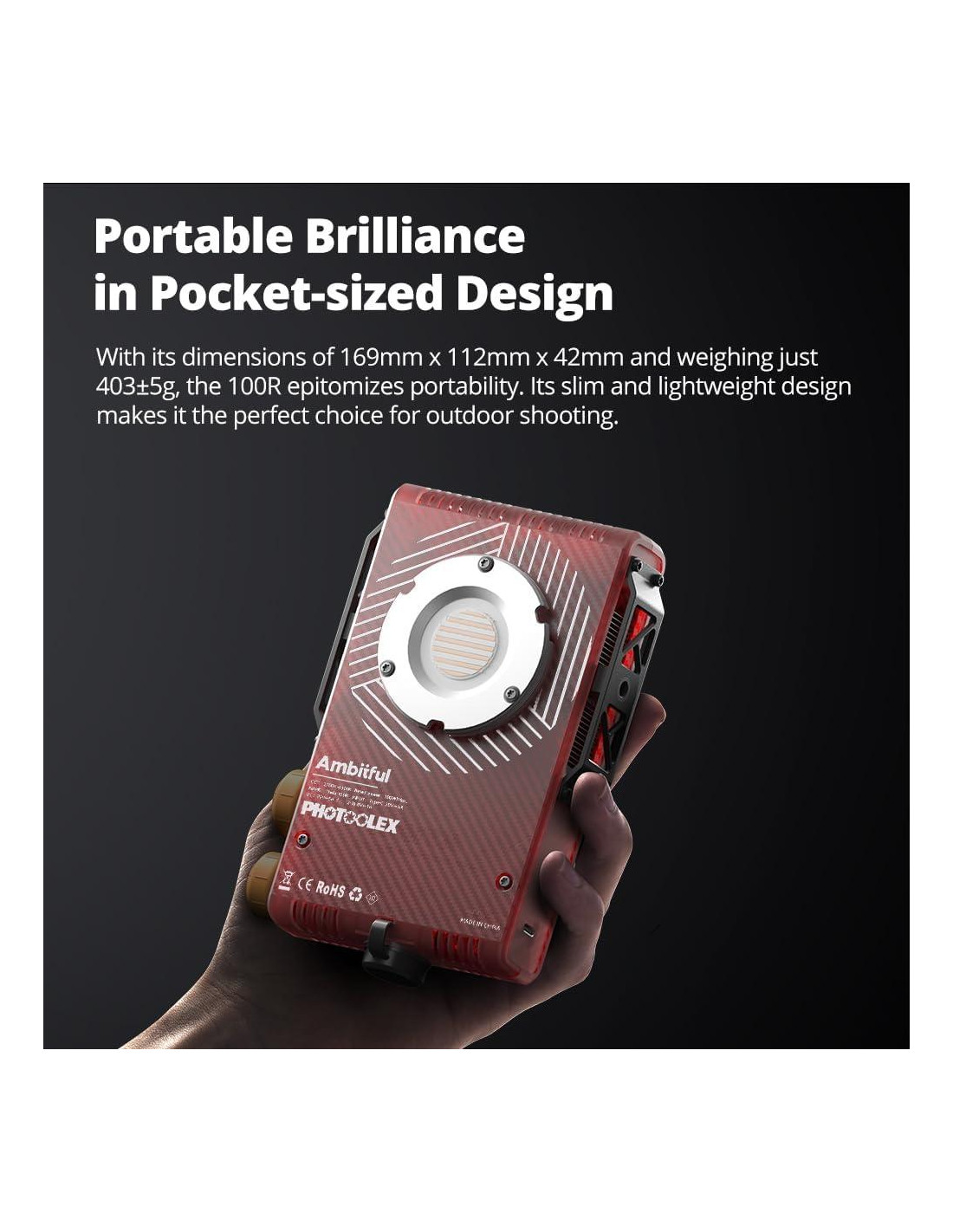 - Potencia Compacta de 100W: El elegante Ambitful Q100Lite ofrece 100 vatios de brillo en un diseño del tamaño de la palma de la mano. Proporcionando hasta 3861 Lux (1m), ofrece una iluminación potente en un paquete portátil para uso profesional y en movimiento.