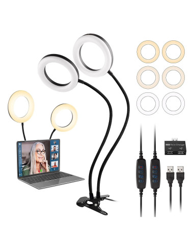 Luz de Anillo Doble para Selfies 3 Modos de Color, 10 Niveles de Brillo: luz fría/luz natural/luz cálida; ajuste de 10 niveles de brillo del 10%-100%. Ángulo de Rotación de 360: Nuestra luz de anillo puede proporcionar un ángulo de rotación de 360, permitiéndote encontrar el mejor ángulo para iluminar tu sujeto, mejorando tus fotos o transmisiones en vivo. Clip Ajustable: Este clip de metal se puede sujetar a una mesa con un grosor máximo de 5 cm, por lo que esta lámpara se puede utilizar ampliamente en escritorio, tocador, armario, muebles, cabecero, etc. Suministro USB Conveniente: Funciona con la mayoría de los dispositivos que soportan puerto USB (5V), como laptop, PC, banco de energía, cargador USB, adaptador de CA, etc. Detalles de Alta Calidad: dos luces de anillo de 6 pulgadas, brazos de cuello de ganso, clip ajustable, cables USB de 55 pulgadas. Amplia Aplicación: maquillaje de belleza, grabación de video, transmisión en vivo, enseñanza en línea