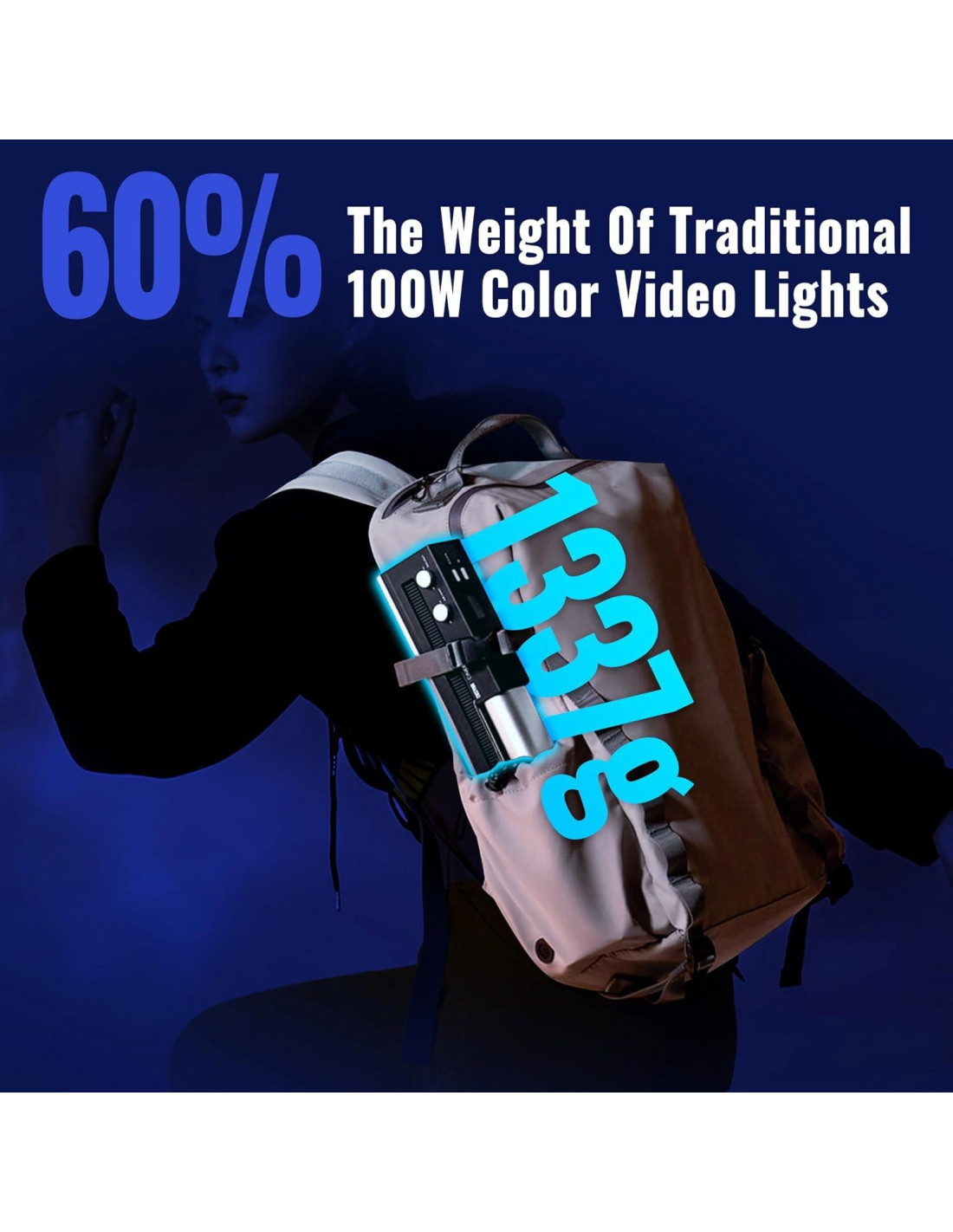 - 36,000 Opciones de Color Con mezcla de cinco colores RGBWW, la luz ZHIYUN C100 ofrece 36,000 opciones de color y puede alcanzar una salida de potencia total de hasta 100W. Presenta un CRI de > 95, TLCI de > 98, y un rango de temperatura de color de 2700K a 6500K. Equipado con 6 efectos de iluminación RGB y 12 efectos de iluminación de escena, es la solución ideal para TikTok, YouTube, vlogging y fotografía.
