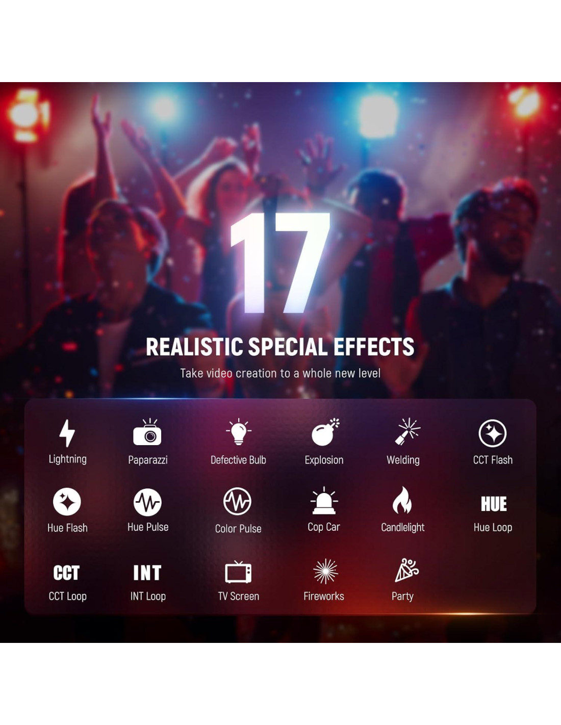 - [Iluminación de Película RGB Brillante con 17 Escenas] Hay 3 modos de luz. El Modo CCT ofrece iluminación bicolor de 2700K-6500K, un rango de atenuación de 0-100% y corrección GM de -50/+50. El Modo HSI ofrece 36000 colores mezclados por ángulos de matiz de 0-360 y saturación de 0-100%. El Modo FX ofrece 17 efectos de escena especiales preestablecidos que harán que tu creación de video sea más realista