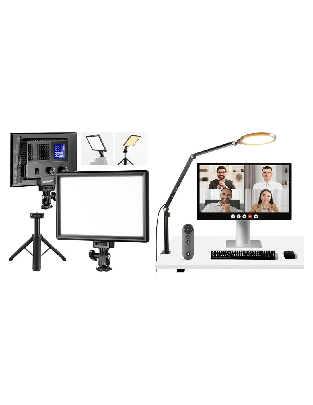 - Versátil Kit de Panel de Luz LED para Video El panel de luz LED de 9" cuenta con 58 LEDs cálidos y 58 fríos, ofreciendo una salida máxima de 10W con una iluminación máxima de 600lux (0.5m) y un CRI alto de 95+. Equipos de iluminación para grabación de video de podcast, retratos, sesiones fotográficas de estudio, fotografía de productos/comida, transmisiones en vivo, etc. Con un mini trípode para ajuste de altura, un adaptador de zapata fría para posicionamiento de ángulo, un cable USB y una batería de litio de 4000mAh incorporada para carga. Nota: La bolsa de transporte NO está incluida