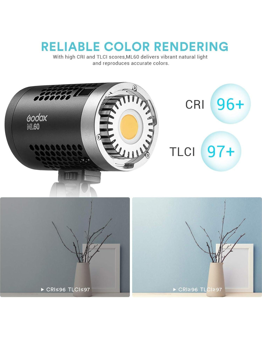 - Fiable Renderizado de Color. Con puntajes altos de CRI96+ y TLCI97+, la luz de video portátil ML60 ofrece luz natural vibrante y reproduce colores precisos. Efectos incorporados con 8 FX de iluminación preestablecidos, puedes simular los efectos de ILUMINACIÓN (1-3), FLASH, CONFERENCIA, PAPARAZZI, TV y BOMBILLA ROTA para lograr una grabación creativa.
